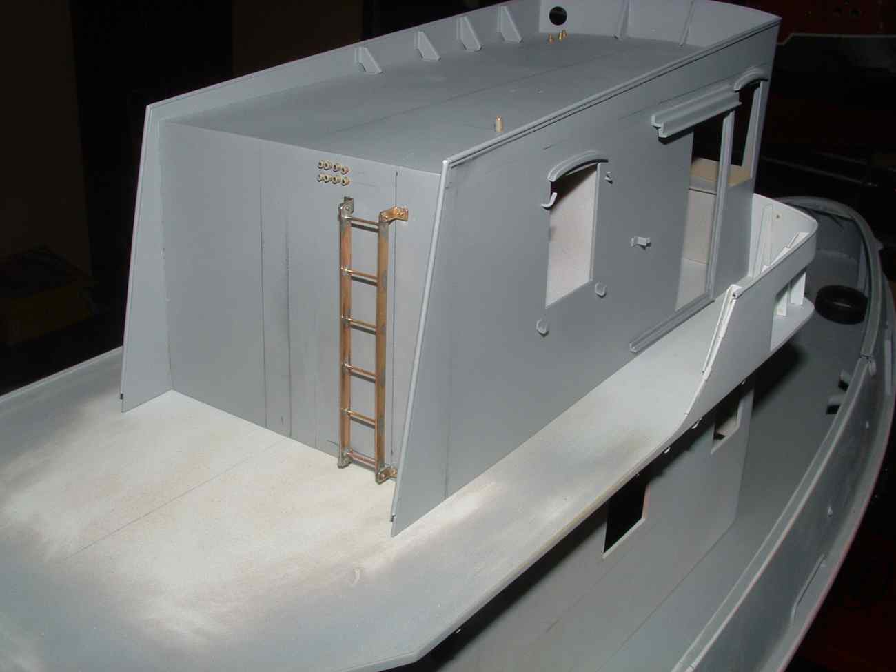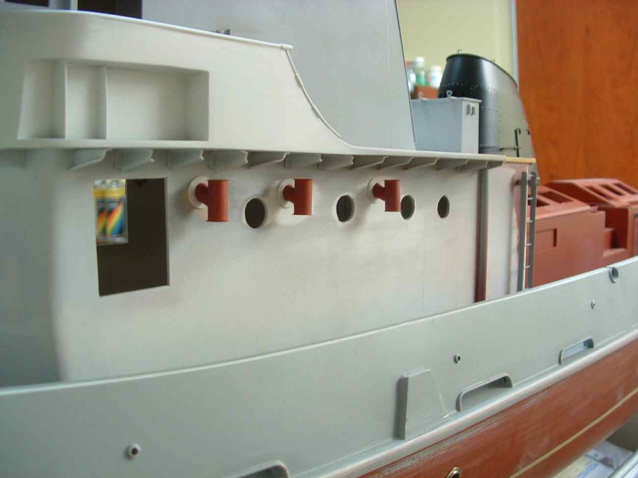 Ciąg dalszy zmagań ze Strażakiem , dorobiłem nawiewniki na nadbudówce i zamocowałem prowizorycznie drabinki wcześniej zrobione a tak te elementy wyglądają zamontowane na swoich miejscach , całość oczywiście jeszcze malowana jak na razie podkładem a drzwi przyklejone do zdjęcia na gumę do żucia