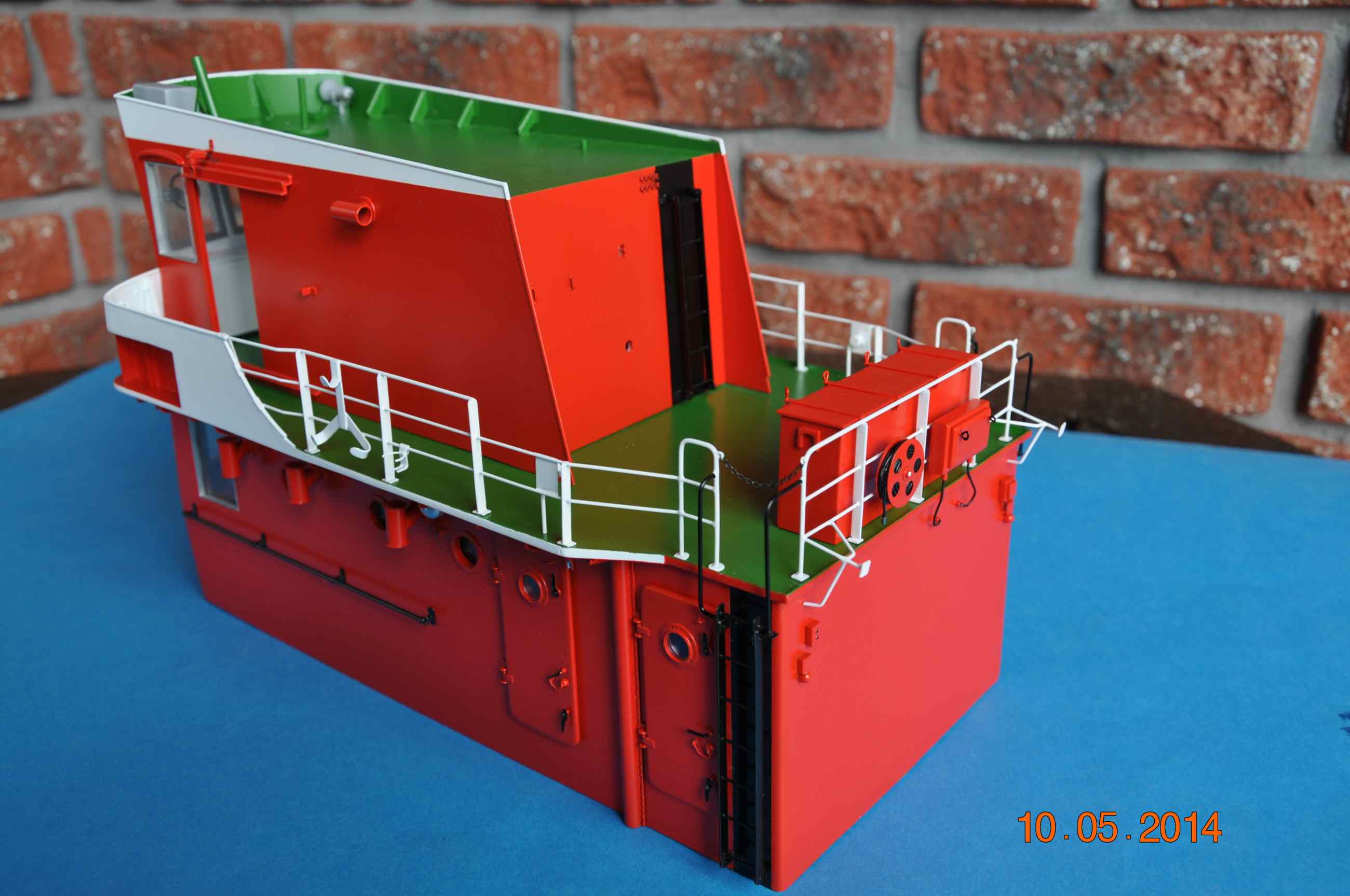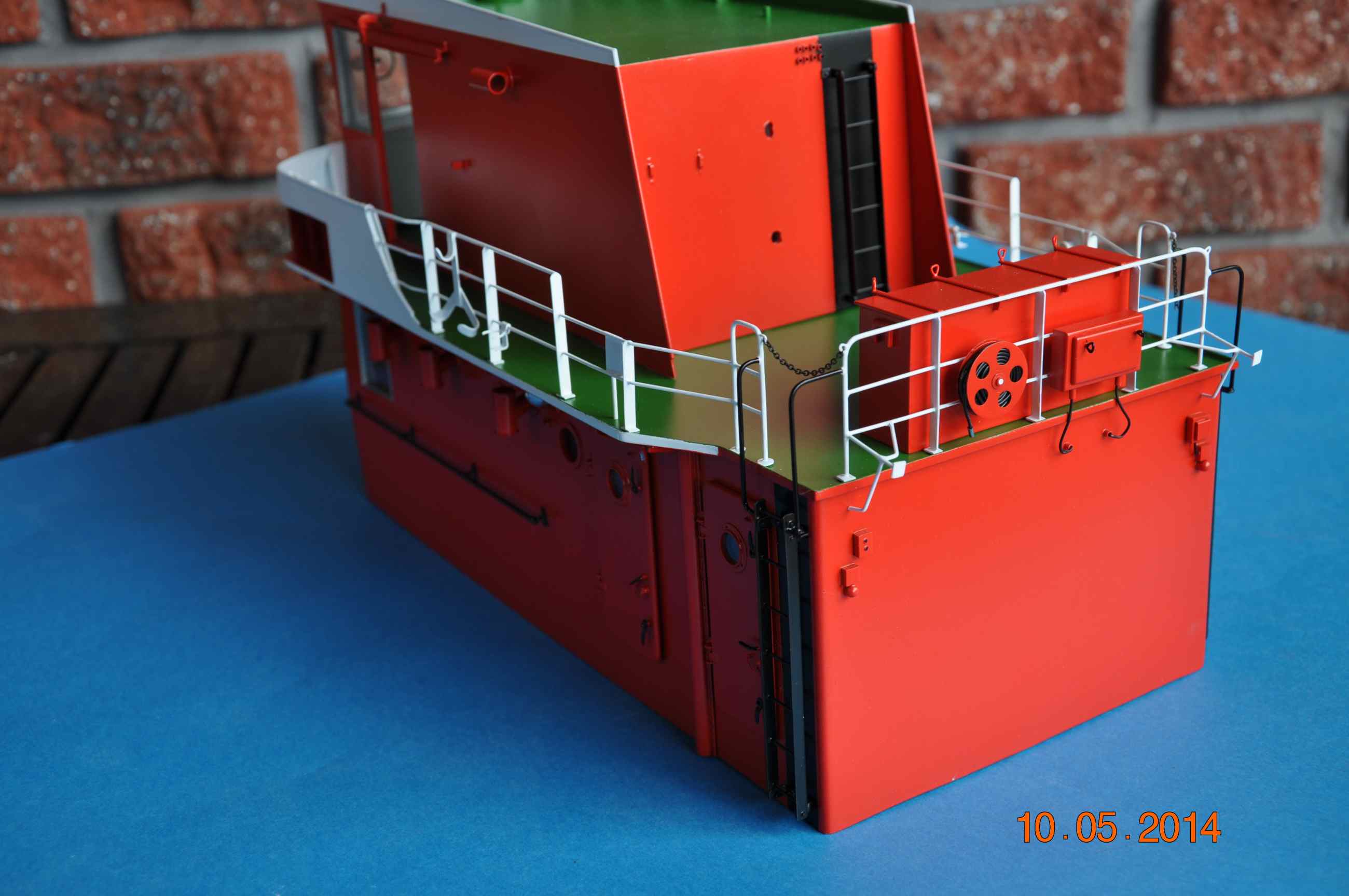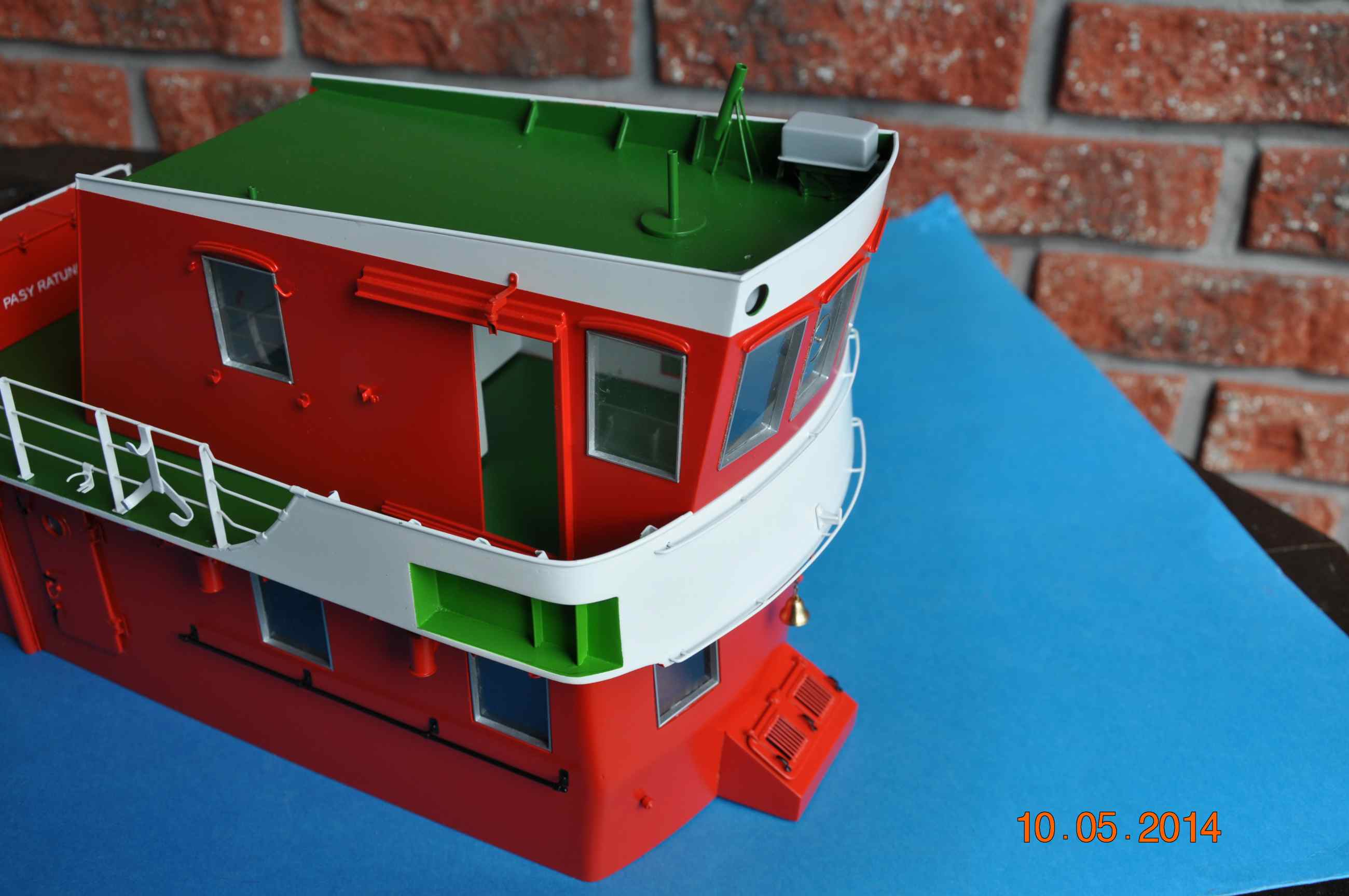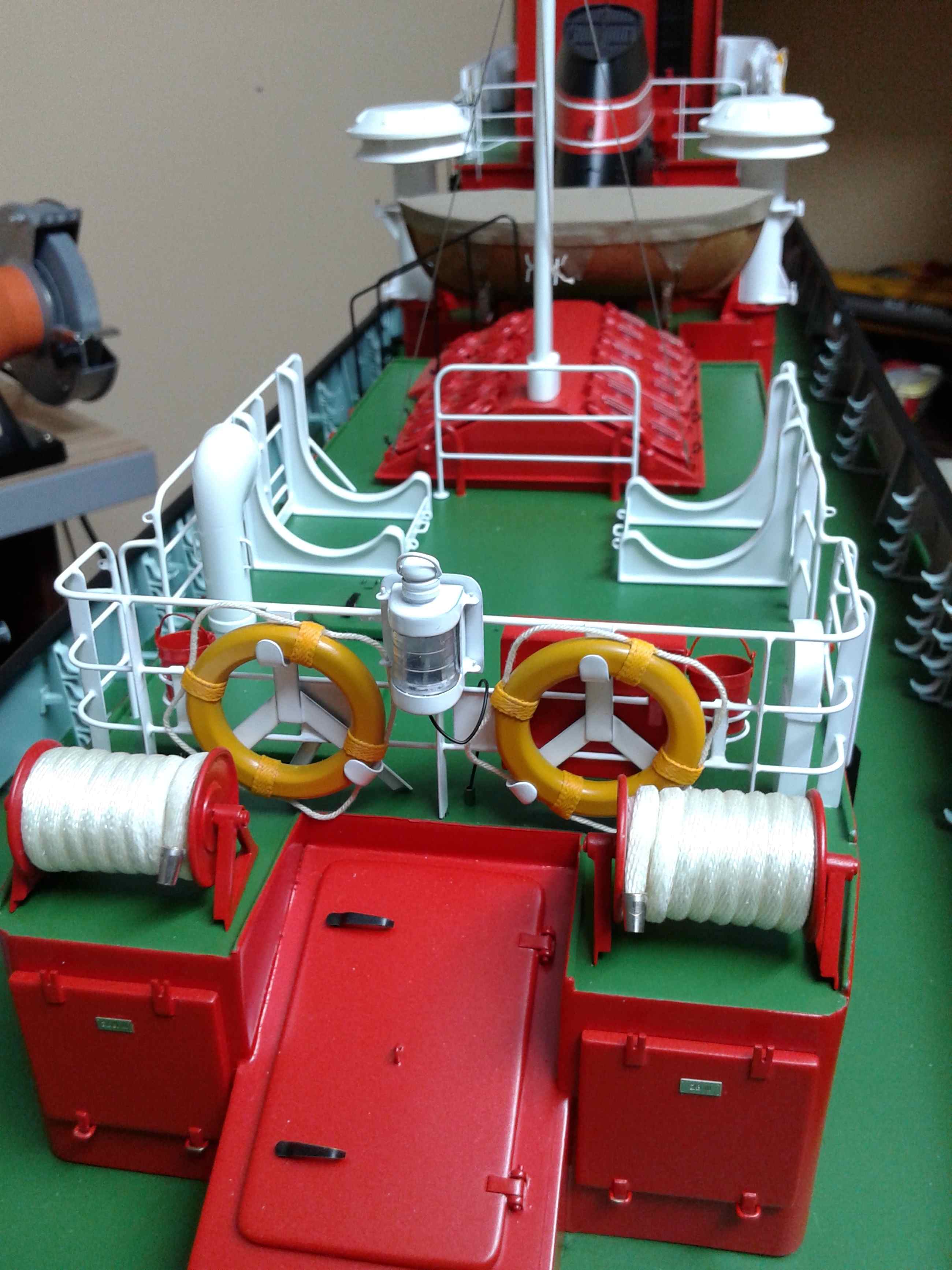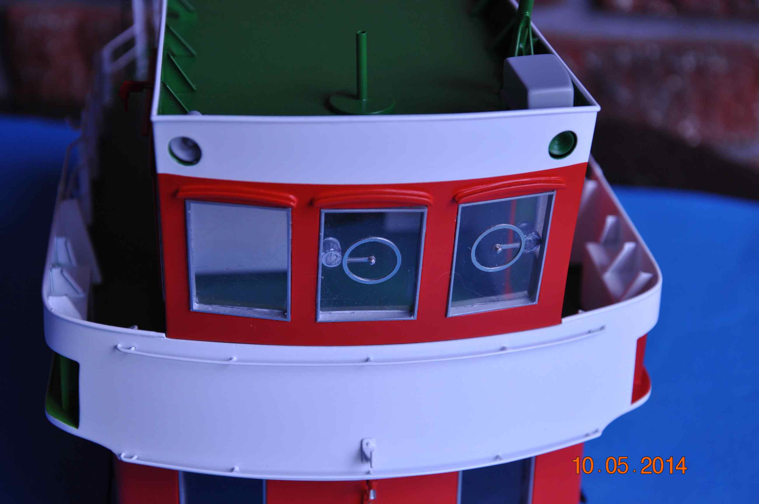 Kolejnych kilka detali na swoim miejscu, relingi na głównej nadbudówce założone , okna oraz wirujące szyby założone , dzwonek oraz tabliczka producenta tez na swoim miejscu. Teraz trzeba wyposażyć sterówkę .