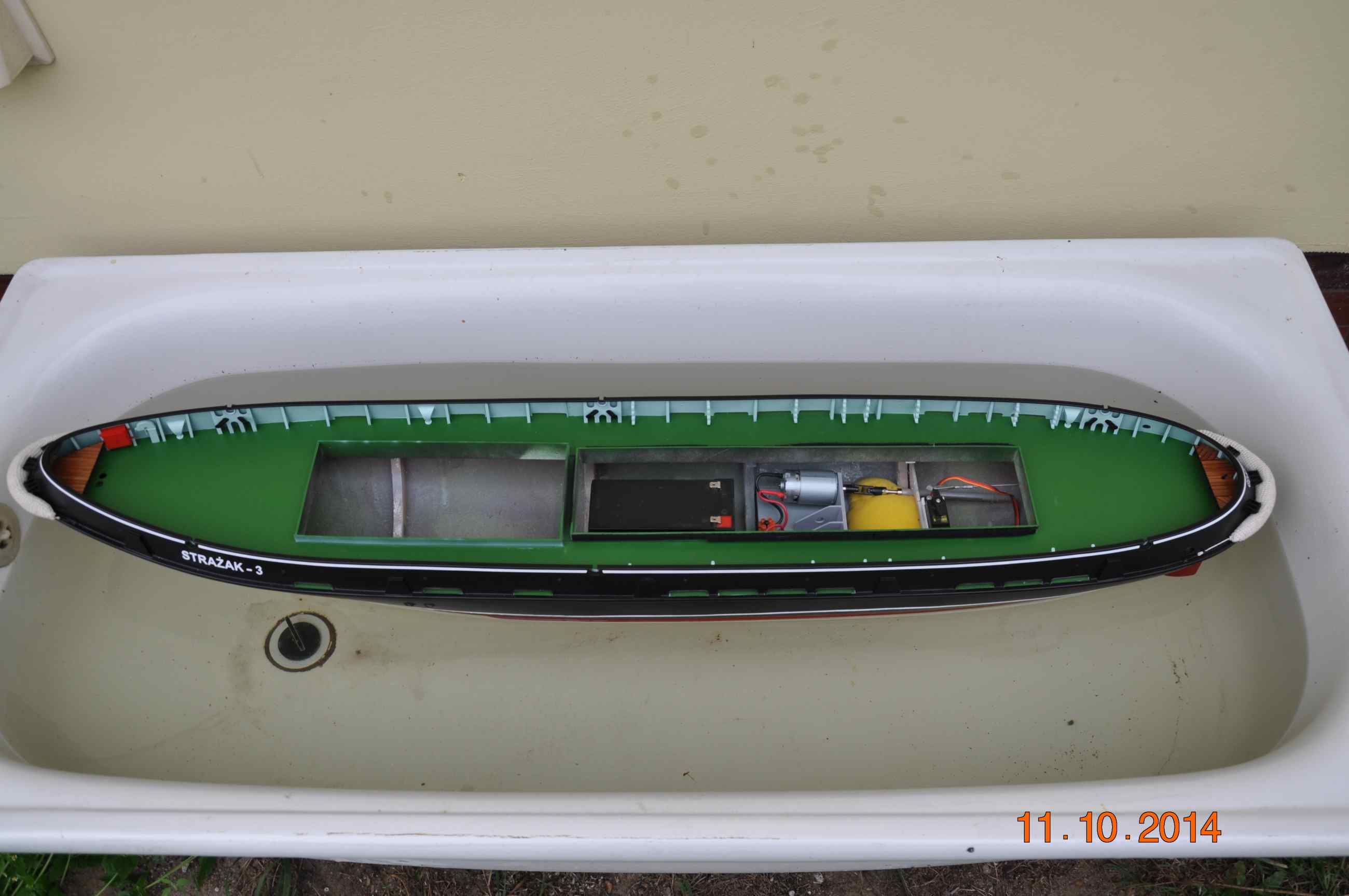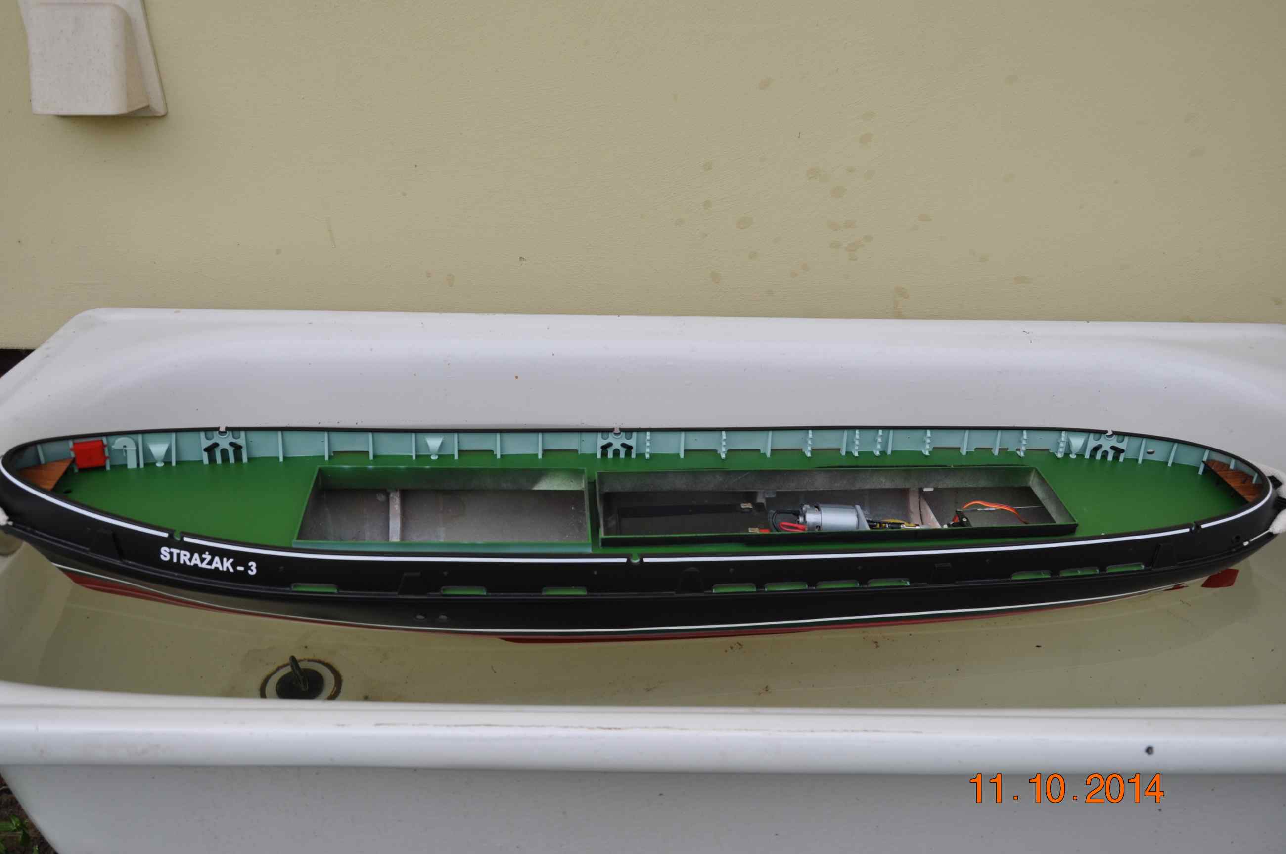 Dziś Strażak dostał chrzest pierwszy raz kadłub powędrował do wody , celem sprawdzenia gdzie zamontować podstawę pod akumulator jak i ile jeszcze brakuje do pełnej wyporności , nie wygląda to źle bo do linii wodnej brakuje jeszcze jakieś 1,5cm czyli spokojnie będzie można wszystko zamontować a i bez balastu się nie obędzie.