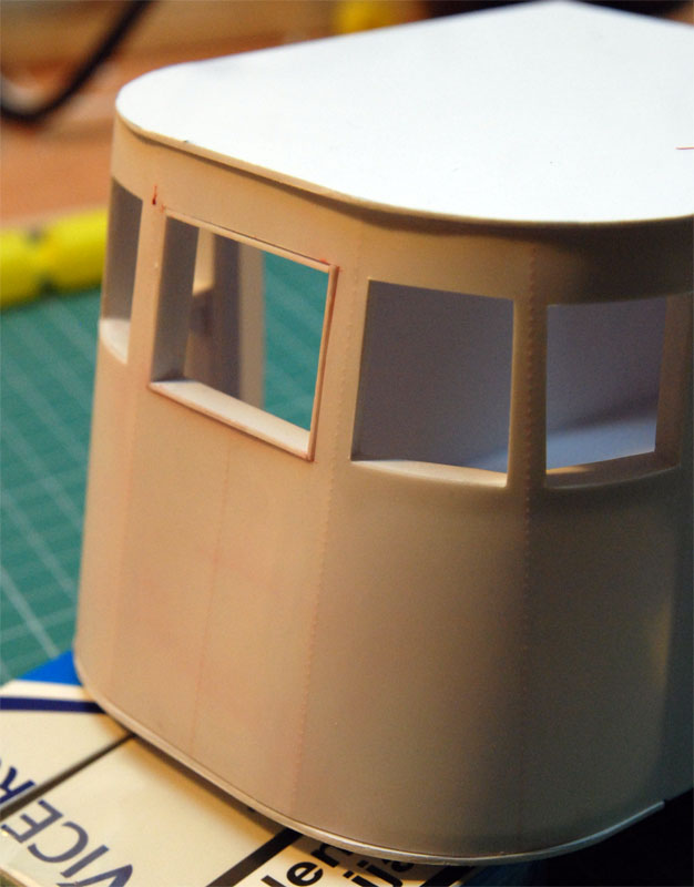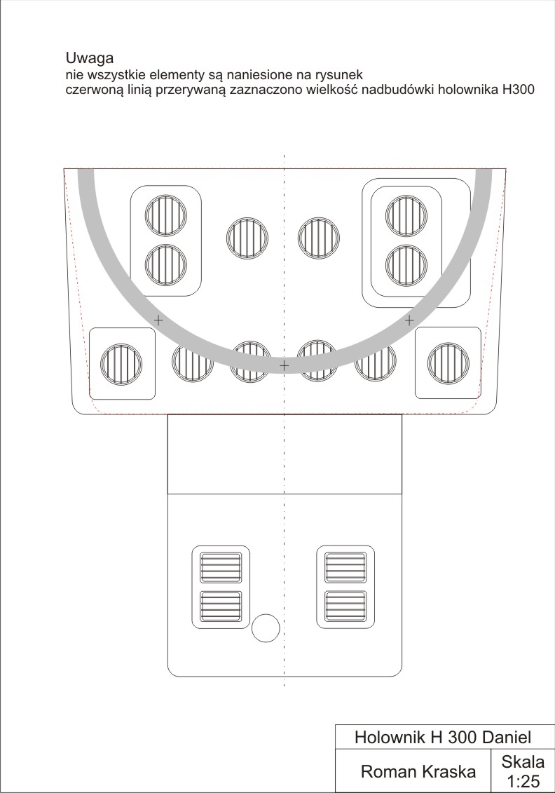 Witam prace nad holownikiem staneły w miejscu z powodu.......no własnie sporych zmian konstrukcyjnych w stosunku do orginalnego H300 jak i do planów modelarskich nr3 opracowanych przez Pana Stanisława Woźniaka Dokładniej zmiany dotyczą nadbudówki maszynowni i swietlików oraz haka holowniczego. W orginale (opieram sie na planach modelarskich rozmiar nadbudówki jest bardziej trapezowy a więc od strony rufy jest węższy niż posiada obecny holownik Daniel. NA rysunku poniżej czerwonym kolorem pokazuje jak znaczne są różnice. Następna sprawa to "daszek swietlika" który występuje w seryjnym holowniku a w Danielu brak. Następna sprawa że otwory swietlików sa okrągłe a nie prostokątne jak w seryjnym holowniku. zdjęcie nr 2. Jak widać zmian jest bardzo wiele i w zasadzie należało by stworzyć nową dokumentacje techniczną całej nadbudówki oraz sterówki. Łoże i cały hak holowniczy jest też wiekszy co zaznaczyłem szarym kolorem na rysunku jak i osie podstawy mocowania do nadbudówki. Wszystkie te zmiany wpłyną na końcowy wygląd Holownika a co za tym idzie budowa modelu bedzie ciekawsza. Przyznam sie że abym te wszystkie zmiany mógł zrealizować muszę najpierw wkleić pokład do kadłuba i tu mam problem gdyż pokład jest płaski a powinien być wypukły. i zdaje się że z tego pokładu co mam zrezygnuje a zrobię nowy tylko nie bardzo mam pomysł jak sie do tego zabrać gdyż pokład jest wygięty w 2 płaszczyznach i jedynie metoda słomkowa należało by to zrobić. I tu mam prośbe do Was może ktoś ma lepszy pomysł jak sobie z takim pokładem poradzić ? bo mnie już głowa puchnie i... pustka nadal w głowie.