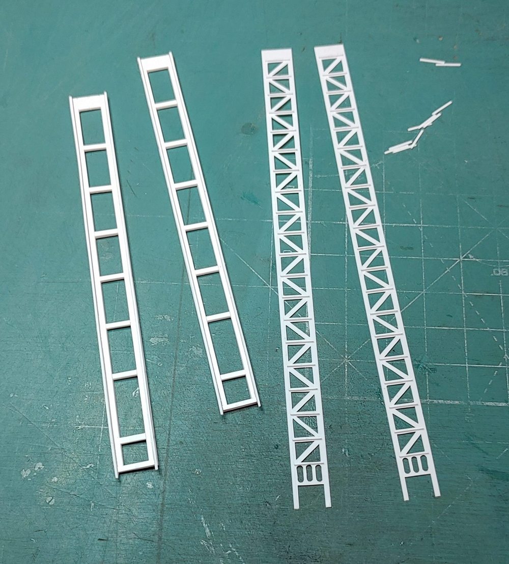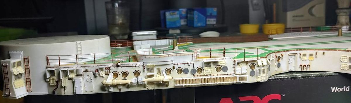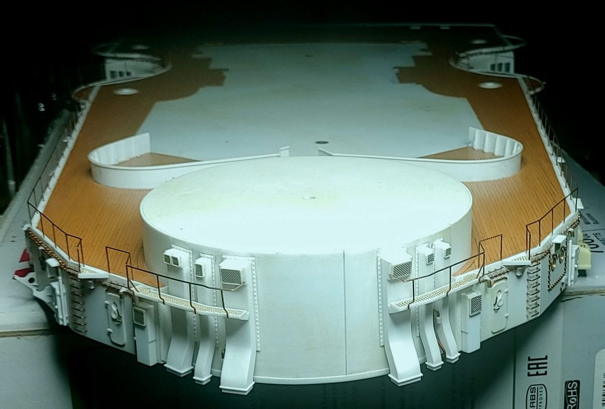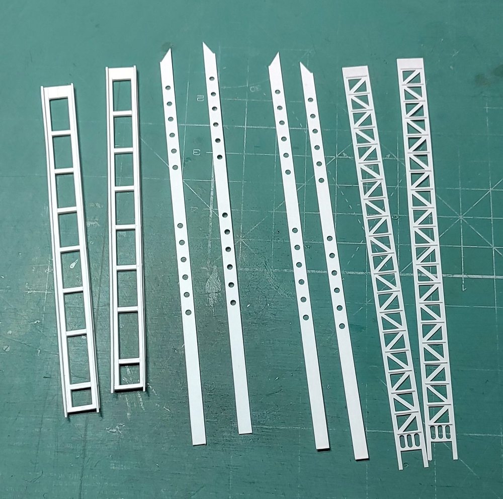 Wykonałem kolejne elementy; podstawy wodnosamolotów, w oryginale wysuwane hydraulicznie z wnęk w pokładzie głównym. Elementy przylegające bezpośrednio do pływaków samolotów wykonałem ruchome by przy ostatecznym montażu wszystkiego ładnie przylegały. Każda z podpór to 23 pojedyncze części a cały podzespół ma 8 mm wysokości