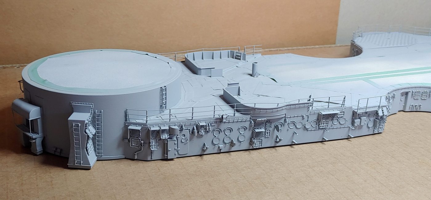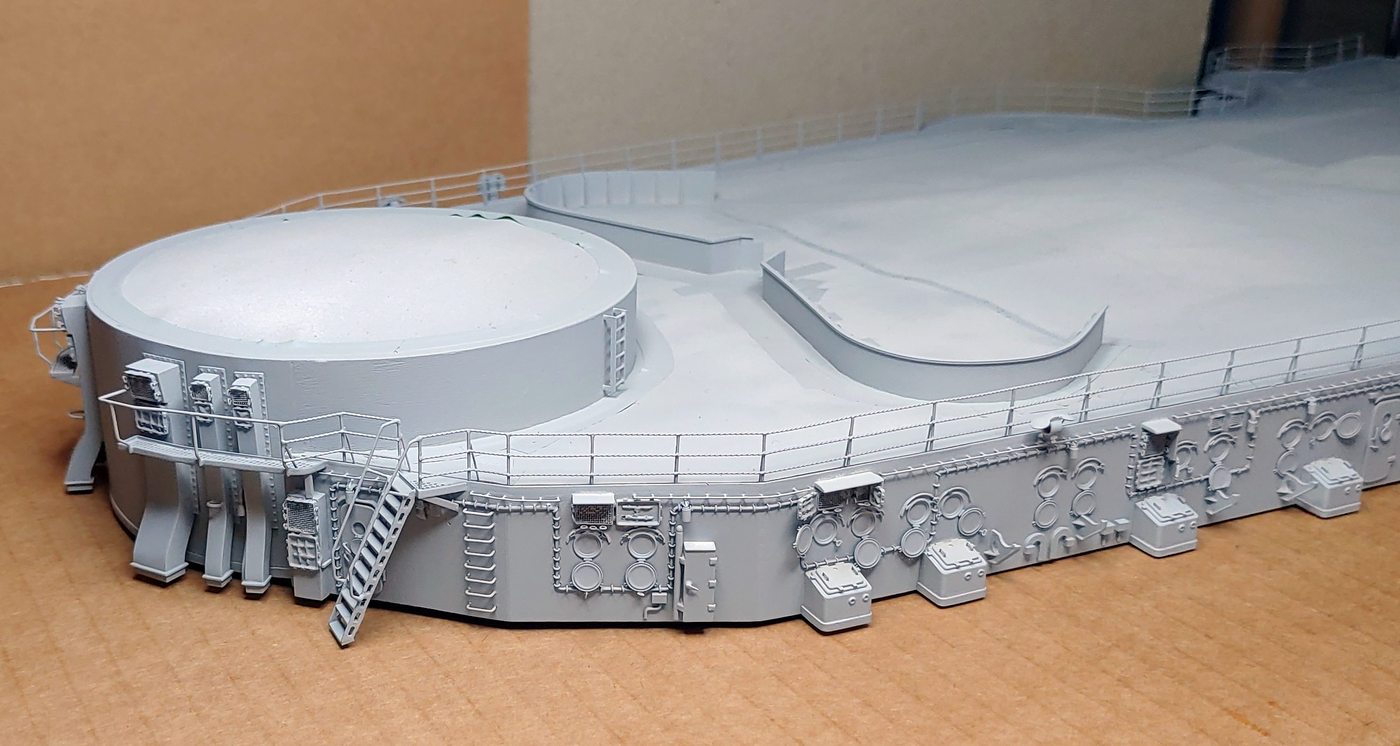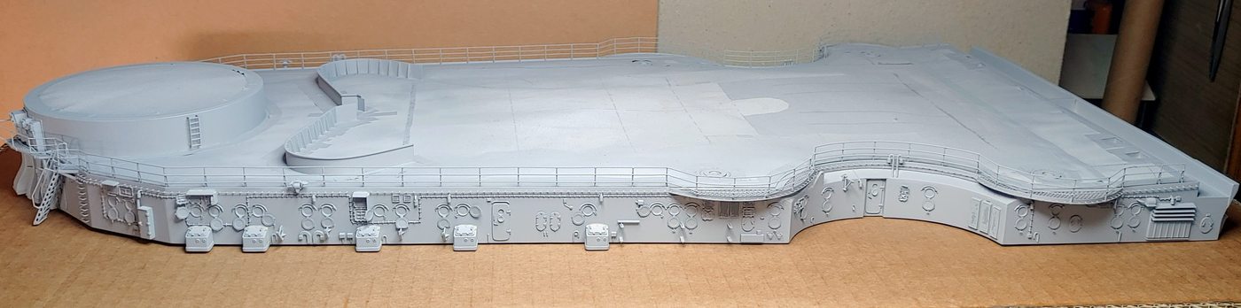 W dniu dzisiejszym najniższe poziomy nadbudówek doczekały się malowania podkładem. Teraz kilka dnia ż podkład całkowicie wyschnie i utwardzi się a ja w międzyczasie zrobię kolejny mały element w postaci kutra motorowego 9,2 m Motorbarkasse.