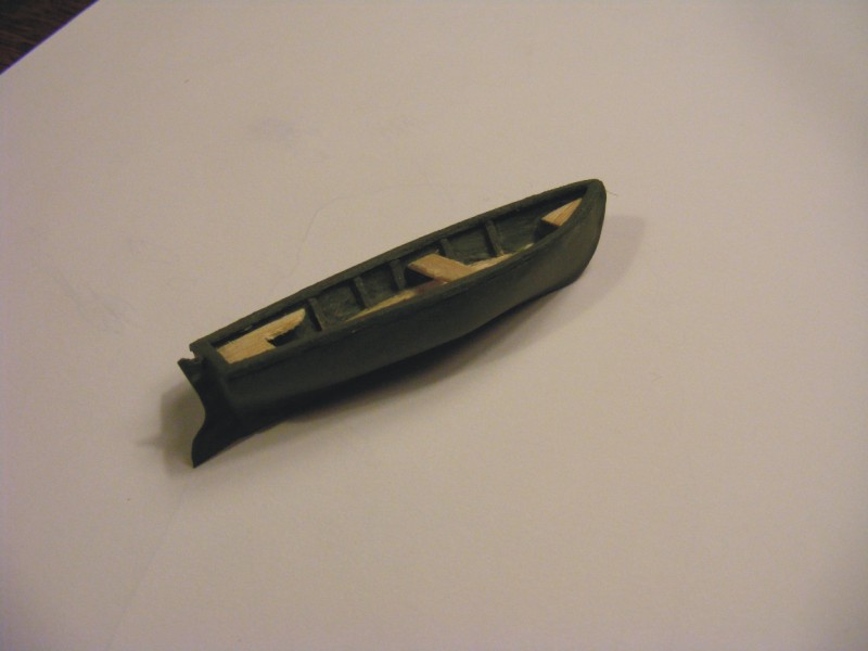 Pomimo braku aktywności na forum, powstało kilka detali wyposażenia pokładu. Teraz przyszła kolej na szalupy. Trochę utknąłem. Proszę o poradę jakim sposobem je wykonać? Szalupy mają 7 i 9 cm długości, wg planów burty mają zupełnie płaskie, niedeskowane. Wynalazłem relację z budowy takiej szalupy sposobem wytłaczania na gorąco z folii "ofertówki", ale mam poważne wątpliwości związane ze sztywnością łódki.