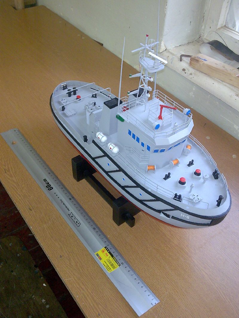 Sam kadłub wykonany był z czterech sklejonych ze sobą sosnowych belek o przekroju 100mmx100mm. Później w ruch poszło dłuto, szlifierki, ścieraki i inne drapiąco-dłubiące sprzęty. Całość pokryta mieszaniną talku i kleju. Zresztą metoda jak przy Pułaskim. Podstawka dosyć solidna bo łajba ważyła z 8 kg. Na widoku od przodu jest krzywa antena i nie jest to błędem bo na prawdziwej jednostce jest taka krzywa (przyszedł raz pan komandor, powiedział że jest krzywa antena, chciał wyprostować i urwał...