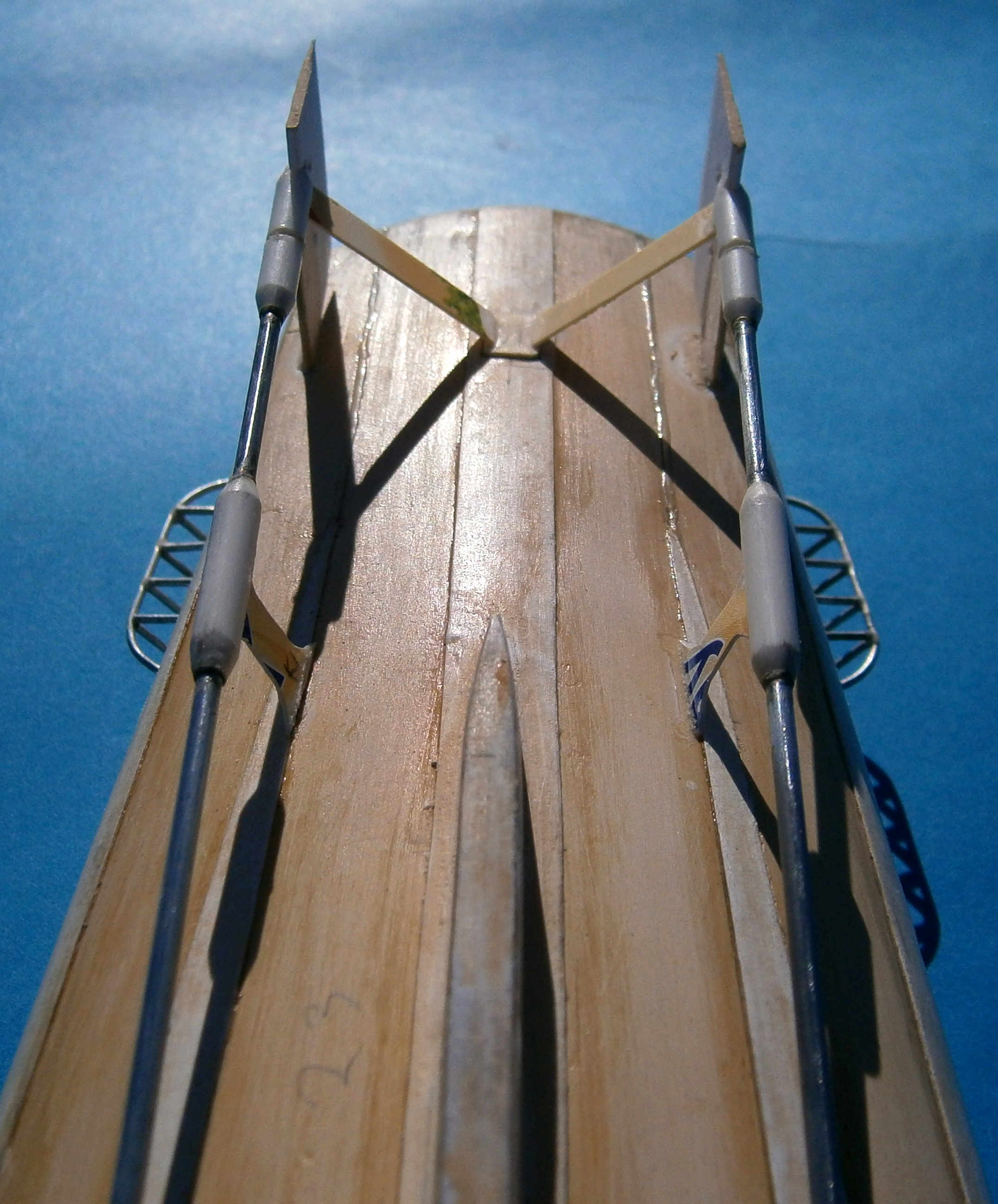 Od ostatniego wpisu dorobiłem wały śrub, do czego posłużyła mi szprycha rowerowa, której średnica tylko o 0,05 mm odbiegała od tego co było mi potrzebne. Wypolerowałem ją dzięki czemu wygląda naturalnie i nie muszę malować wałów. Wsporniki wałów powstały z patyków od lizaka (o idealnej średnicy) i kilku kawałków polistyrenowego pudełeczka po serku topionym. Stery i reszta tych elementów to karton. Ochraniacze śrub zrobiłem z drutu o odpowiedniej grubości. Nie lutował a kleiłem klejem CA, po wyszlifowaniu efekt elegancki, a trzyma się jak trzeba.