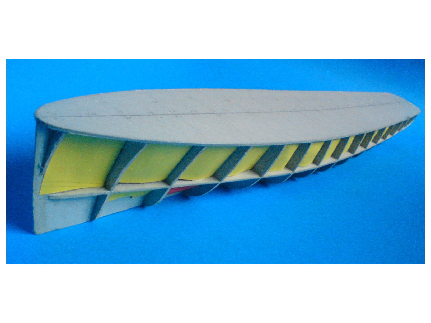 Po tym zabiegu nakleiłem odpowiednio wyprofilowany pokład i zabrałem się do (podobnych jak te wyżej opisane) grodzi w części poniżej linii wodnej okrętu. Tutaj było nieco inaczej, gdyż "grodzie" nie były przyklejane od wręgi do wręgi ale od podłużnicy poziomej na linii wodnej do podłużnici pionowej przy stępce. Najpierw trzeba było przykleić jedną stronę "grodzi", następnie wepchnąć do niej odpowiednią ilość gazet - po czym zakleić całość z drugiej strony.