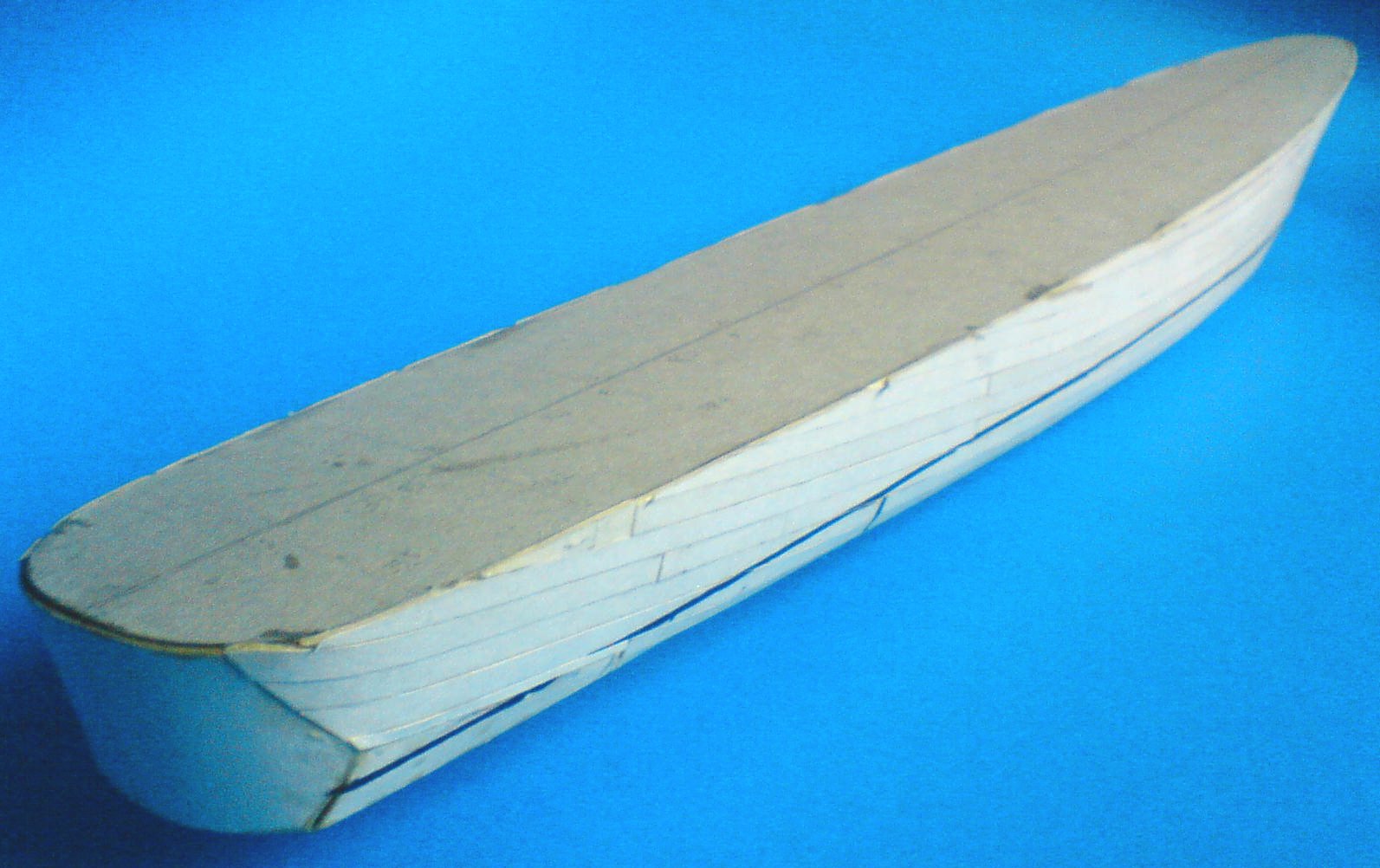 We wcześniejszym opisie pokazałem przygotowany do pokrycia i wypełnienia pianką szkielet. Ponadto wykonałem część poszycia na rufie gdzie powierzchnie burt i dna łączą się ze sobą w formie "kantów". Cały szkielet rozrysowałem o 1 mm węższy niż powinien być po przeskalowaniu z każdej strony oprócz pokładu, dzięki czemu pełny kształt kadłuba był bardzo łatwy do uzyskania chociażby przez naklejenie poszycia zrobionego z tekturki o grubości 1mm.