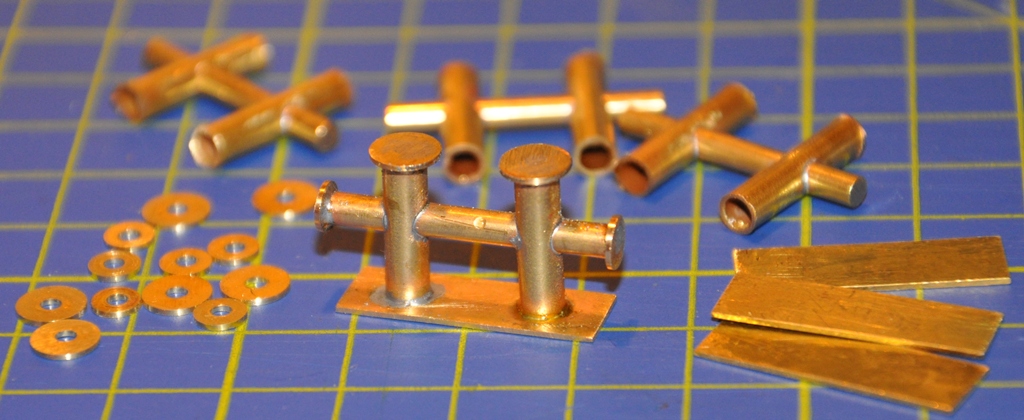 dzisiaj wieczorkiem postanowiłem wyprodukować knagi, niestety nie posiadałem prętów mosiężnych aby w całości sobie wytoczyć, więc musiałem rozłożyć całość na drobne podzespoły. Zdjęcie ukazuje 1 sztukę gotową i podzespoły dla pozostalych trzech.