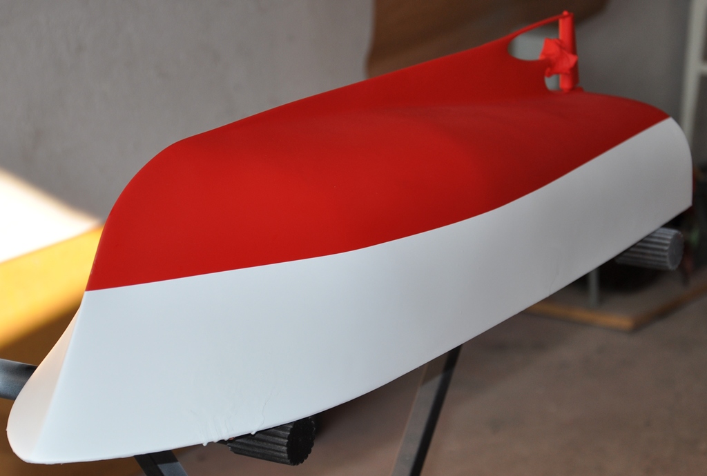 kadłubik otrzymał biały kolor nad poziomem wody no i teraz czekam aż farba się utwardzi, potem doszlifuje delikatnie to co jest nie tak i malowanko lini wodnej na czarno