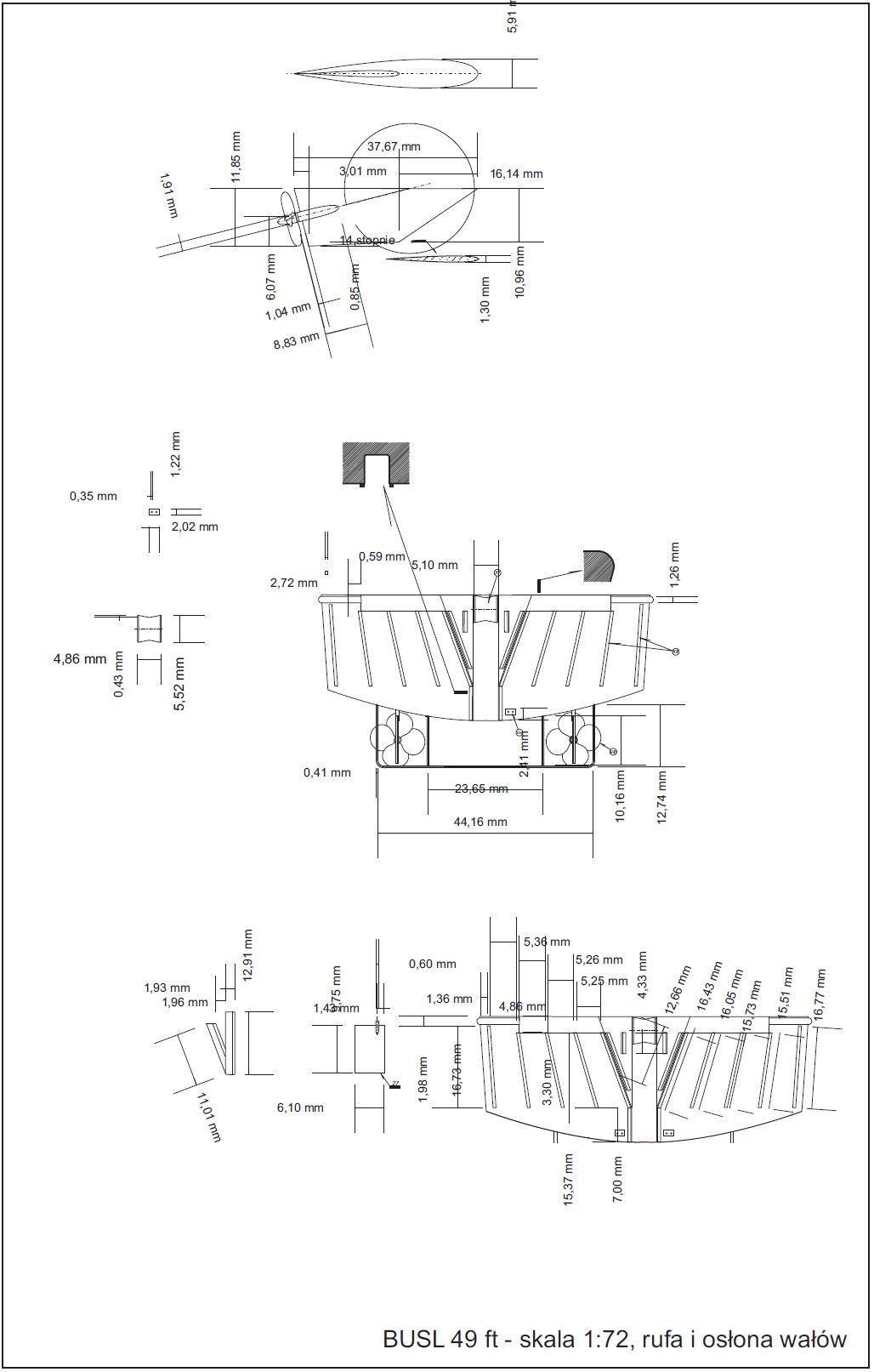 Długo zastanawiałem się z czego wykonać osłonę śrub na rufie i doszedłem do wniosku, że najlepiej będzie zrobić ją z blaszki mosiężnej 0.4 mm. Wyciąłem pasek z naddatkiem, tak żeby wystarczyło na bolce, które wkleiłem w poszycie w celu wzmocnienia całej konstrukcji. Przed wklejeniem pasek blachy opiłowałem na profil dwustronny wypukły. Dodatkowe dwa wsporniki wykonałem z plastyku 0.5 mm również wyprofilowany dwustronnie. Całość po sklejeniu (klejem CA) trzyma się nad wyraz mocno.