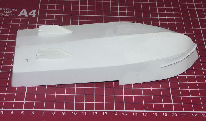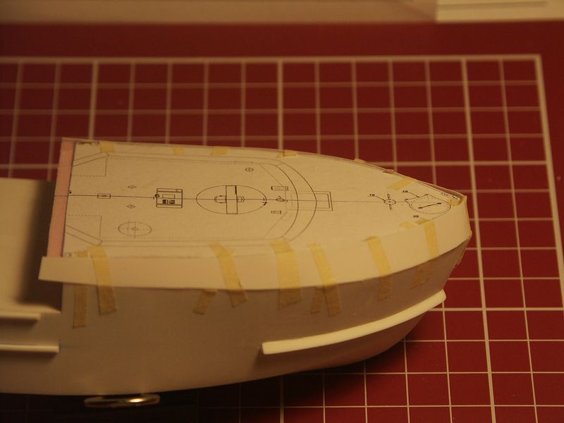 Od ostatniego wpisu minęło trochę czasu, ale nie próżnowałem. W międzyczasie zrobiłem dziobowe nadburcie. Najpierw „wystrugałem” ze styroduru klocek na kształt nadburcia. Następnie z papieru dopasowałem szablon i po kilku przymiarkach przerysowałem nadburcie na plastyk 0,25 mm.