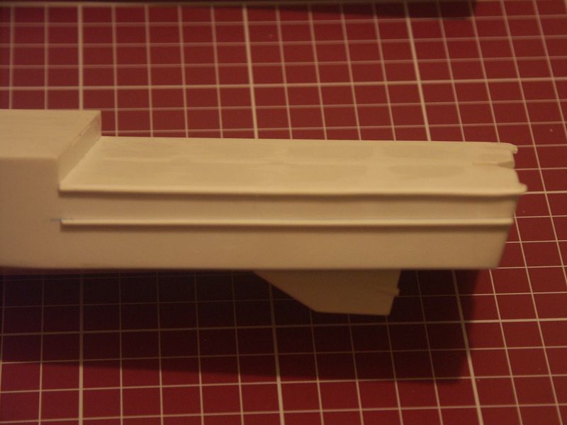 Kolejnym etapem było przyklejenie poziomej listwy relingowej ( tej na której będzie mocowany reling). Wycinałem fragmenty z rzutu poziomego, naklejałem na plastyk i wycinałem ostrym skalpelem. Kleiłem również bez pośpiechu. Po przyklejeniu całości byłem nieco zdziwiony, że pasek o szerokości ok. 0,5 mm bardzo wzmocnił sztywność całego nadburcie.