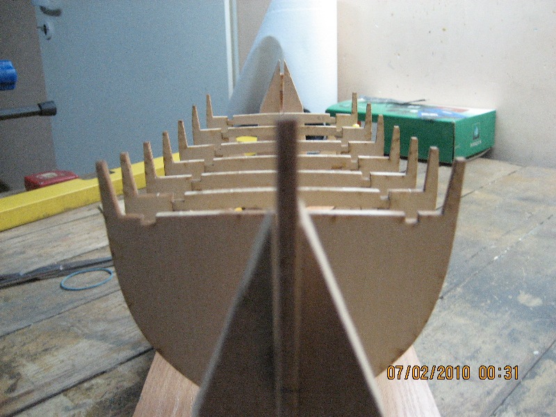 2. Przekonałem się do - podpowiadanego wielokrotnie - wypełniania części dziobowej i rufowej szkieletu miękkim drewnem w celu uzyskania poprawnego, bez załamań i spłaszczeń, kształtu kadłuba.