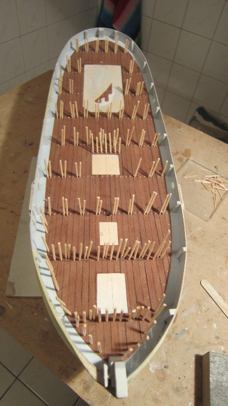 9. Przetestowałem kołkowanie pokładu. Do wiercenia otworów dobrze jest mieć szablon, lub chociaż twardą linijkę, o którą można oprzeć wiertło. Każdą wykałaczkę można wykorzystać do czterech otworów, ostrząc ją do kolejnego na szlifierce. Klejenie należy wykonywać z minimalną ilością kleju. Wciśnięta wykałaczka nie wypadnie, a nadmiar kleju wokół wciśniętego patyczka bardzo utrudnia późniejsze cyklinowanie.