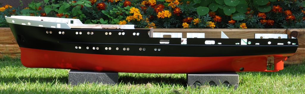 No i można powiedzieć że to co najgorsze jest za mną. Zdjąłem maskowanie z malowanego kadłuba nad którym tyle walczyłem (jak się lakierni nie ma tylko zwykły garaż to potem trzeba poprawiać jak jakiś paproch czy robal wyląduje na świeżej farbie). Jest kilka drobnic do poprawki ale to już igłą można skorygować. Ogólnie jestem mocno zadowolony ze swojej pracy, porównując problemy jakie miałem przy malowaniu jachtu IRA.