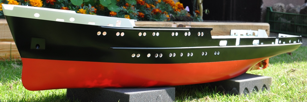 No i można powiedzieć że to co najgorsze jest za mną. Zdjąłem maskowanie z malowanego kadłuba nad którym tyle walczyłem (jak się lakierni nie ma tylko zwykły garaż to potem trzeba poprawiać jak jakiś paproch czy robal wyląduje na świeżej farbie). Jest kilka drobnic do poprawki ale to już igłą można skorygować. Ogólnie jestem mocno zadowolony ze swojej pracy, porównując problemy jakie miałem przy malowaniu jachtu IRA.