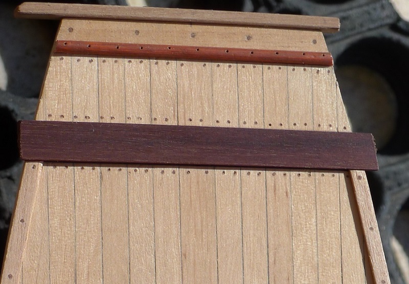 Witam. Tak Piotrze , masz 100% rację - powinno być bez dyskusji jednakowo. Tłumaczenie naiwne ,ale prawda jest taka ,że przejrzałem wiele relacji i widziałem kołkowanie po linii, które , przepraszam Panów – bardziej mi się podoba. Model treningowy. Drugą linię zrobiłem zgodnie z propozycjami, trzecią po linii i zdecydowałem się na drugi wariant. Ten pokład będzie praktycznie niewidoczny, ponieważ nad pokładem rozciąga się zadaszenie. Główny będzie kołkowany jednakowo. Pozdrawiam