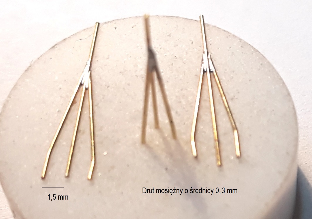 blaszki 0,1mm. Uchwycony drut szlifuję dremelkiem aż pasuje dokładnie do danego przęsła.