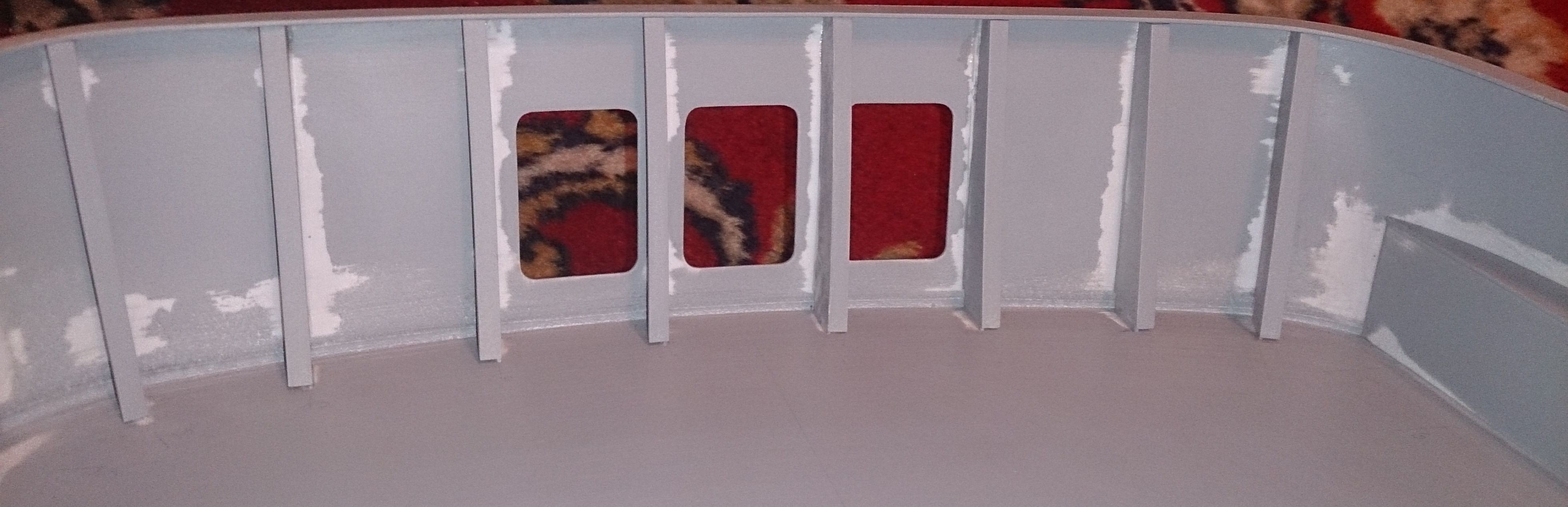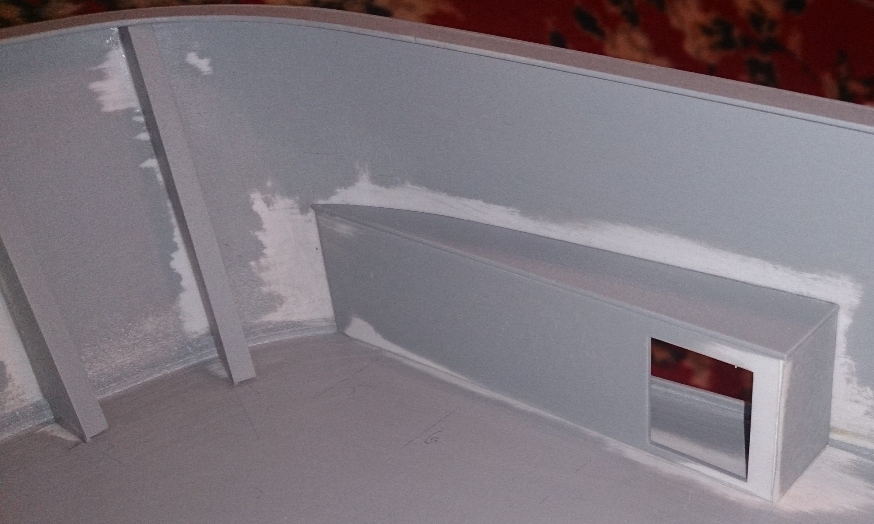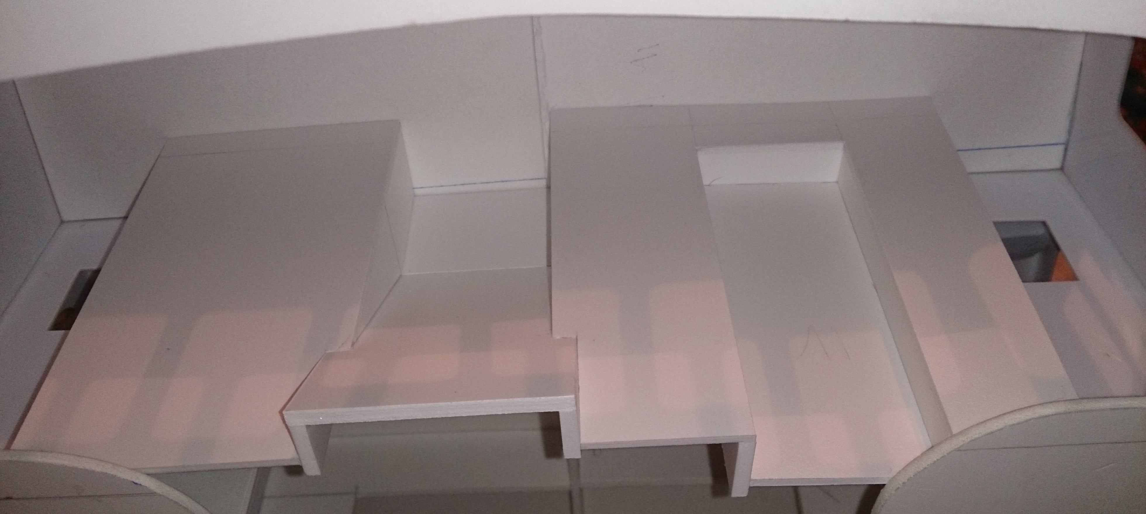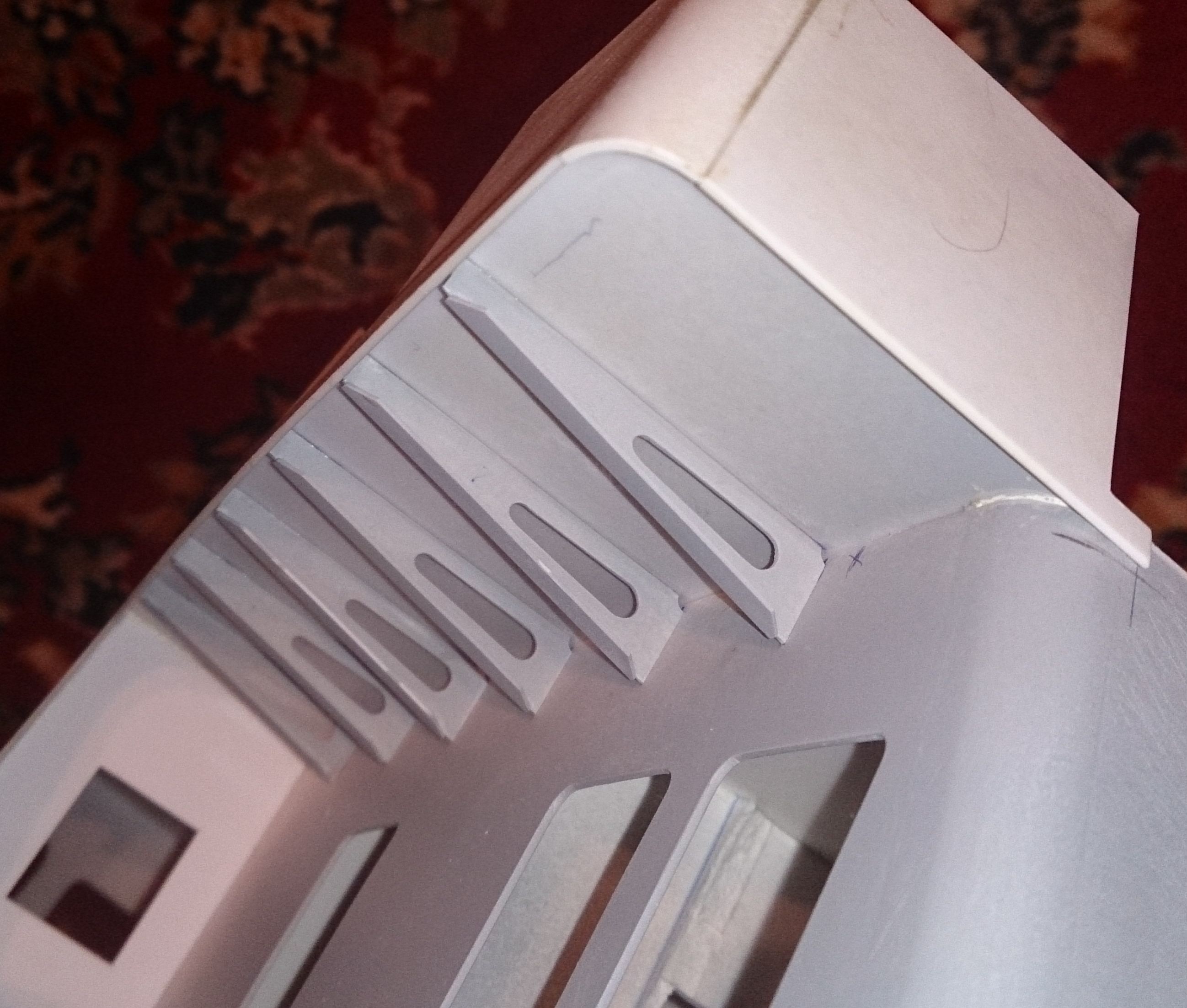 Wkleiłem wsporniki nadburcia nadbudówki oraz wsporniki pod nawisem pokładu, wklejone osłony burtowych lamp nawigacyjnych oraz zrobiona lecz nie wklejona rufowa ściana sterówki
