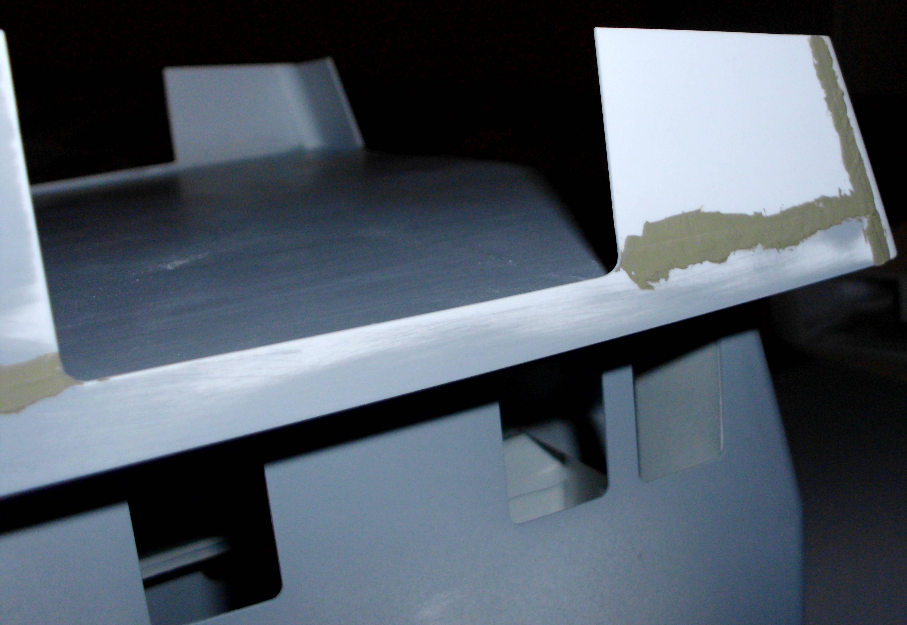 Lepiej nic nie mów. Ile roboty z tym wycinaniem bo wycinałem na gotowej nadbudówce żeby było równo. Sporo niedociągnięć jest a aparat tego nie odda. Głębsze rysy, niedokładnie szpachlowane połączenia itp. Chcę się z tym uporać czyli duże elementy nadbudówki żeby się w końcu zająć drobnicą a nie chce robić wielu rzeczy naraz. Szpachluje motipem wykańczającym kolor buraczkowy.