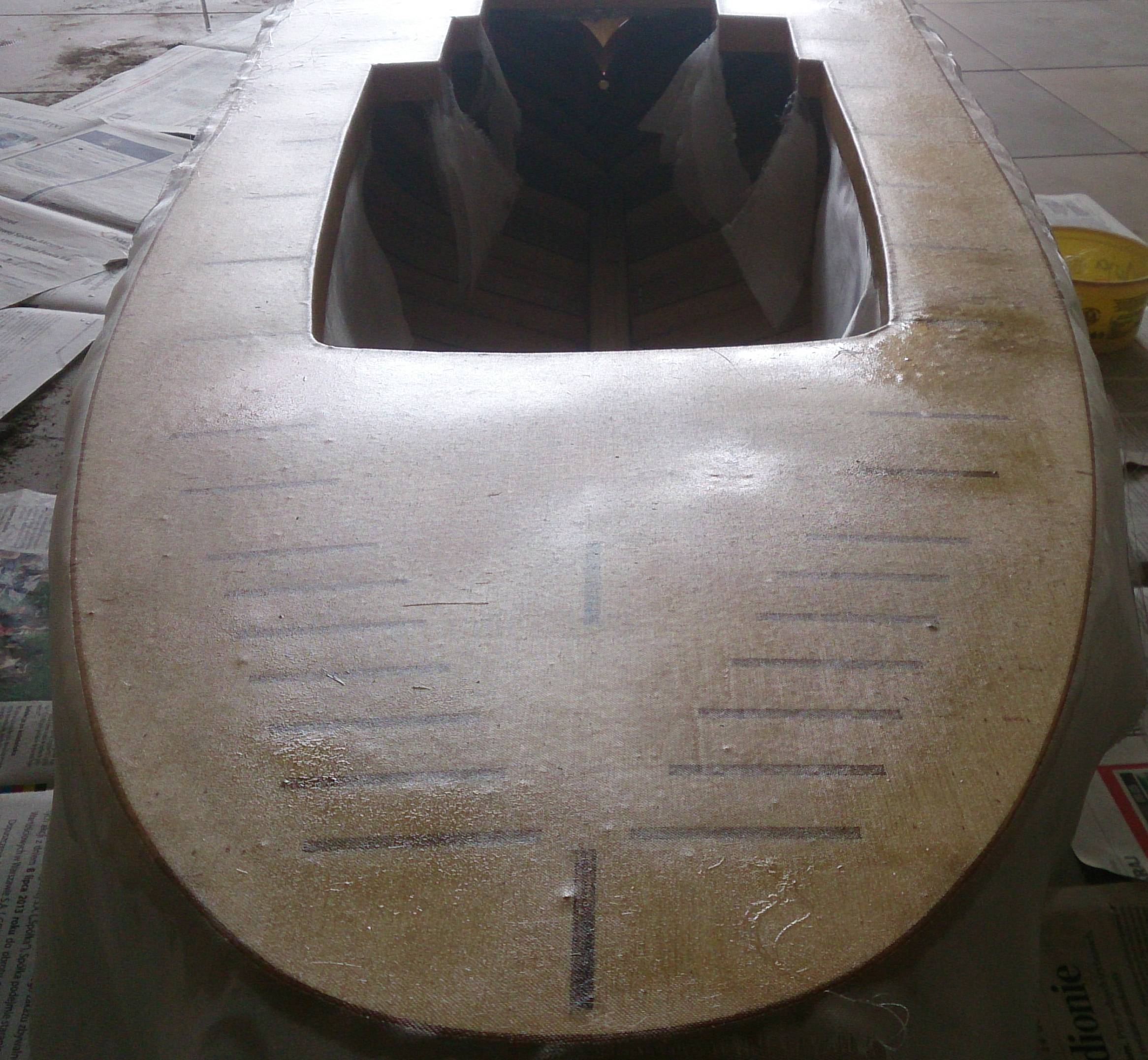 Ok. Dzięki panowie za opinie. Póki co mam 1kg żywicy epoksydowej z utwardzaczem plus 3m kw tkaniny 48 gr/mkw. Wystarczy to na 2 warstwy na pokład i 1 warstwa na poszycie kadłuba. bedę musiał dokupić pewnie żywicy i maty na dodatkowe 2 warstwy na poszycie kadłuba. Jak w sobotę będzie ładna pogoda to sprubuję z pokładem najpierw i zobaczymy co z tego wyjdzie.