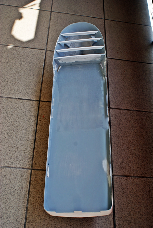 Wymyśliłem sobie że jak pomaluję, to mi niedokładności powychodzą na wierzch. Teraz trzeba to będzie ładnie zeszlifować :) Wewnętrzna część nadburcia była "surowa", tzn widać było strukturę maty i musiała zostać zaszpachlowana. Nie miałem kiedy iść do sklepu i wysłałem żonę. Owszem, kupiła szpachlę Tamiyi, ale szarą i stąd ten kolor nadburci.