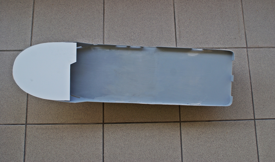 Wymyśliłem sobie że jak pomaluję, to mi niedokładności powychodzą na wierzch. Teraz trzeba to będzie ładnie zeszlifować :) Wewnętrzna część nadburcia była "surowa", tzn widać było strukturę maty i musiała zostać zaszpachlowana. Nie miałem kiedy iść do sklepu i wysłałem żonę. Owszem, kupiła szpachlę Tamiyi, ale szarą i stąd ten kolor nadburci.