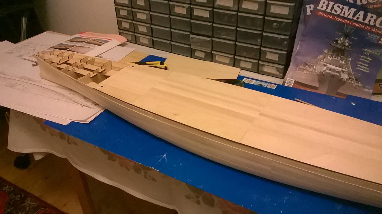 Witajcie koledzy. Od ostatniego postu trochę pracowałem nad Bismarckiem. Niestety nie wzmacniałem jeszcze poszycia. Były święta i jakoś brakło czasu na to, żeby pochodzić po sklepach. Wziąłem pod uwagę to co mówiliście na temat materiałów do wzmocnienia. Jutro mam wolne więc wybiorę się do sklepu modelarskiego i Castoramy. Spróbuję znaleźć tasiemkę o której mówił Marcin oraz tą szmatę szklaną - zobaczę co to jest i jakie ma właściwości. Jutro napiszę co kupiłem. Być może sprzedawca w modelarskim mi coś fajnego zaproponuje. Jeśli chodzi o to co zrobiłem przez ostatni tydzień, to pracowałem nad pokładami. Pokład dziobowy jest połączony i gotowy do przyklejenia. Pokład rufowy również jest sklejony i połączony z rusztowaniem. Sporo czasu poświęciłem na pokład pośrodku. Z resztą zobaczcie sami