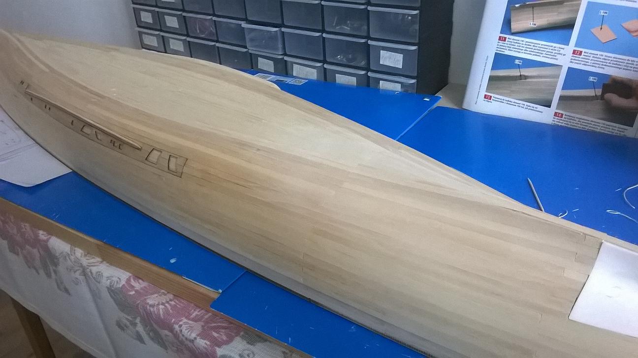 Znalazłem w internecie film na którym dokładnie widać to co wyszło również i mi. Podam link do filmiku. https://www.youtube.com/watch?v=15nHFhaBeTY Na filmie tym około 2 min 25 sek zobrazowane jest dokładnie to o czym mówię. I jako, że na rufie nie będzie raczej z tym problemu, ponieważ błąd ten wynosi około 0,5 mm ; to w części dziobowej jest spory. Zastanawiam się także nad rozwiązaniem jakie zastosował autor filmiku w kolejnej jego części. Mianowicie, wyciął w listewkach otwory od wręgi do wręgi, wyszlifował pozostałość i potem wstawił wzmocnienie i na to części drugiego poszycia (elementy ze sklejki). Proszę was o opinie na ten temat, bo nie wiem czy takie rozwiązanie jest dobre. Ciekawy jestem co ogólnie sądzicie na temat tego jak idzie mi praca. Trochę się rozpisałem, ale myślę że dobrze przedstawiam postępy nad modelem. Wczoraj zabrałem się za nadbudówki. Nad kadłubem prace na razie wstrzymane, do czasu podjęcia decyzji, na temat uskoków w poszyciu. Pozdrawiam wszystkich