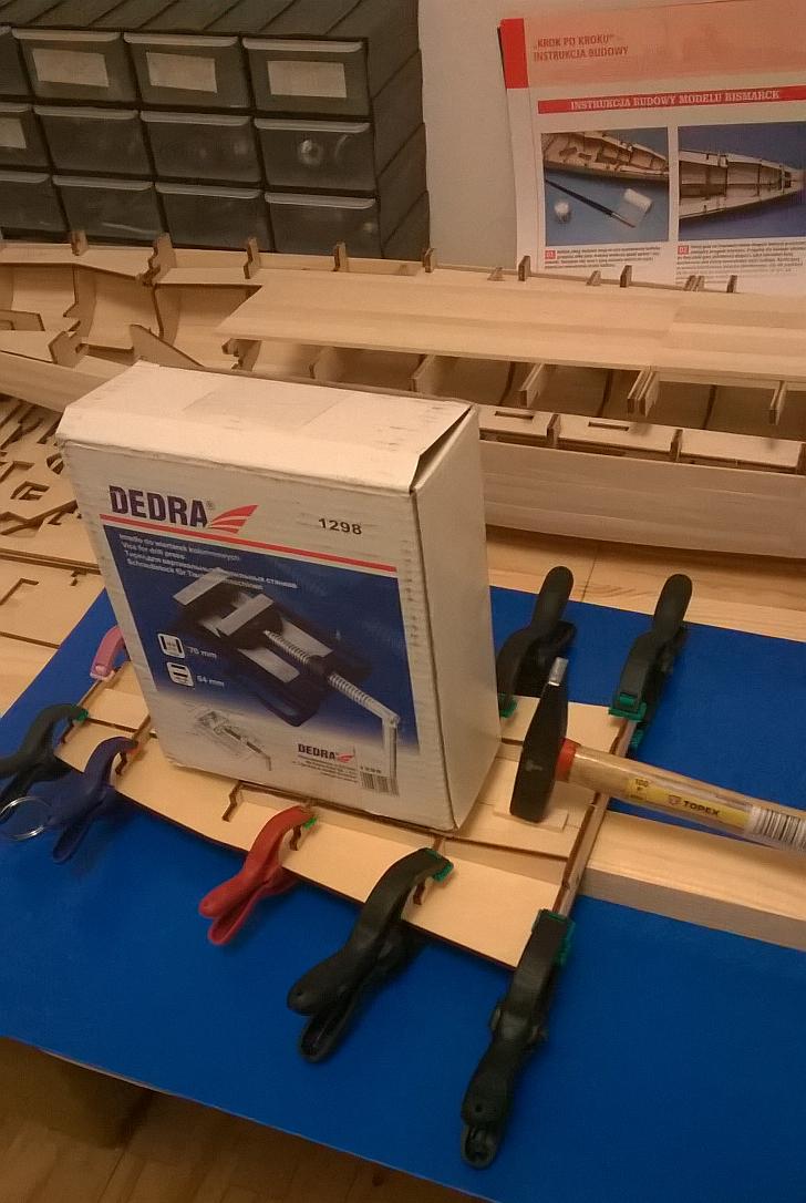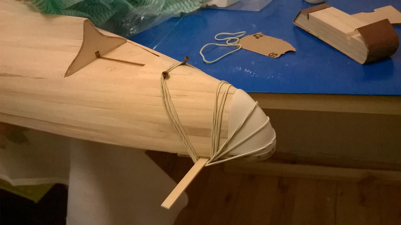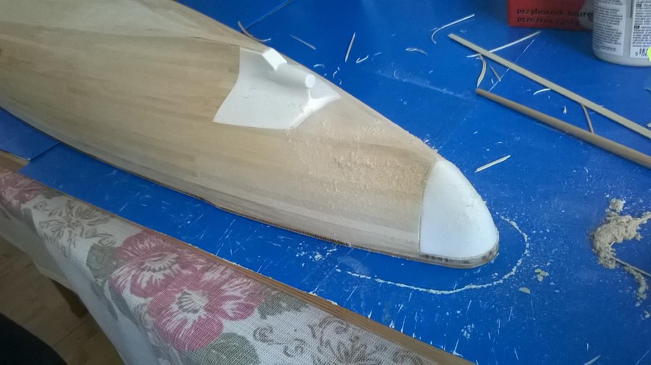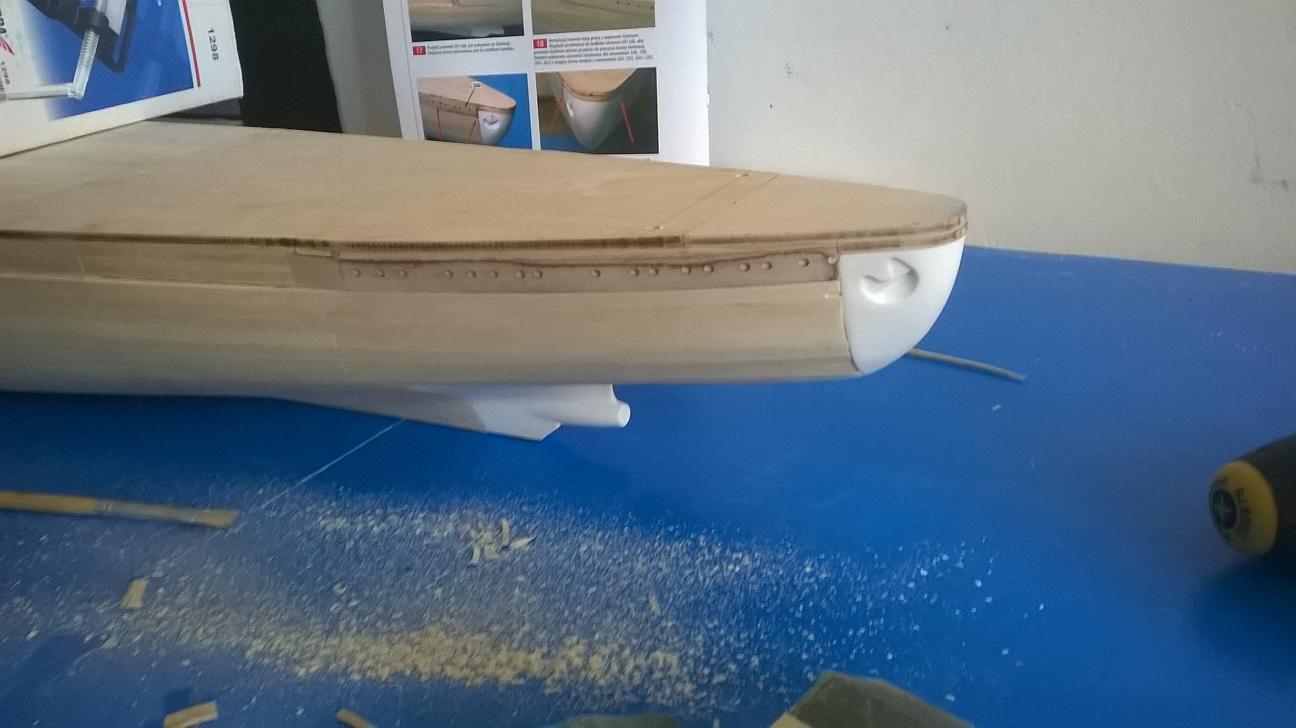Znalazłem w internecie film na którym dokładnie widać to co wyszło również i mi. Podam link do filmiku. https://www.youtube.com/watch?v=15nHFhaBeTY Na filmie tym około 2 min 25 sek zobrazowane jest dokładnie to o czym mówię. I jako, że na rufie nie będzie raczej z tym problemu, ponieważ błąd ten wynosi około 0,5 mm ; to w części dziobowej jest spory. Zastanawiam się także nad rozwiązaniem jakie zastosował autor filmiku w kolejnej jego części. Mianowicie, wyciął w listewkach otwory od wręgi do wręgi, wyszlifował pozostałość i potem wstawił wzmocnienie i na to części drugiego poszycia (elementy ze sklejki). Proszę was o opinie na ten temat, bo nie wiem czy takie rozwiązanie jest dobre. Ciekawy jestem co ogólnie sądzicie na temat tego jak idzie mi praca. Trochę się rozpisałem, ale myślę że dobrze przedstawiam postępy nad modelem. Wczoraj zabrałem się za nadbudówki. Nad kadłubem prace na razie wstrzymane, do czasu podjęcia decyzji, na temat uskoków w poszyciu. Pozdrawiam wszystkich