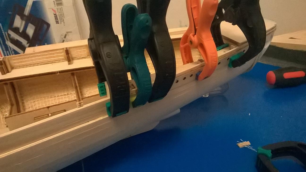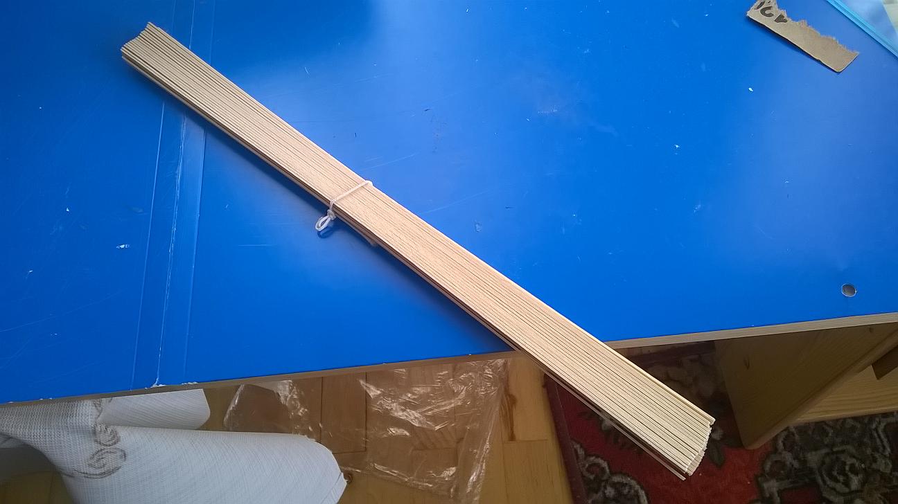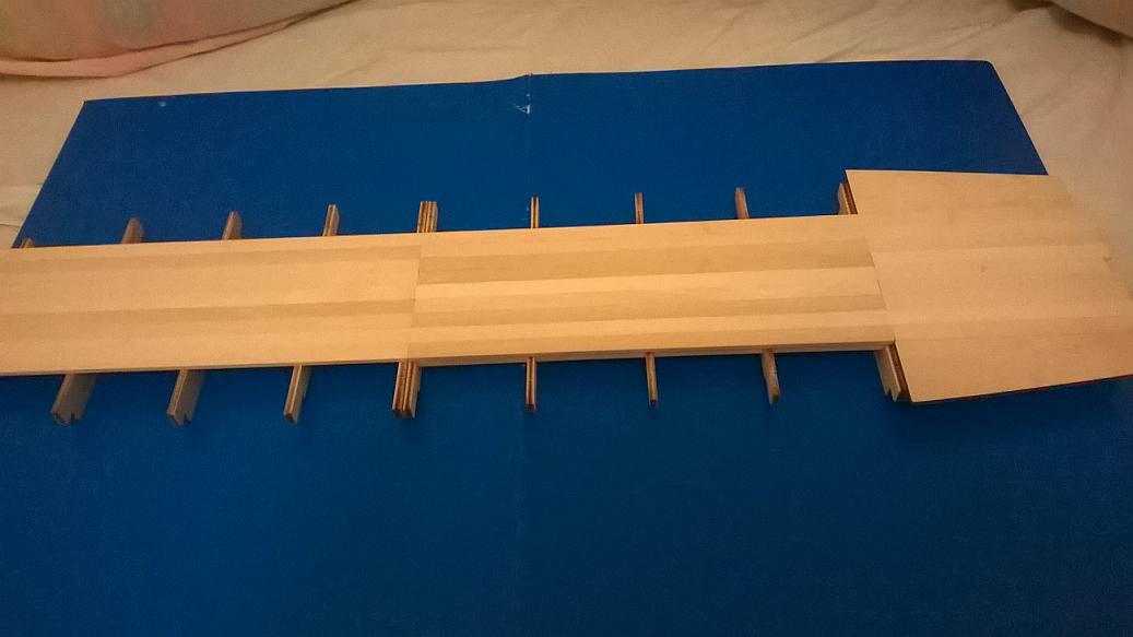 Główne rusztowanie pokładu, okleja się listewkami. Powiem wam, iż listewki które posiadam są dosyć mocno zniekształcone. Ciekawy jestem czy też tak mieliście. Sporo się trzeba namęczyć żeby je prosto przykleić. Dotyczy to też, chodź w trochę mniejszym stopniu, elementów wyciętych ze sklejki. Być może przyczyną tego jest czas, bo jak by nie było, od czasu wydania zestawu minęło już kilka lat. Same wymiary listewek też nie są idealnie równe. Czuć pod palcem malutkie schodki. Czeka mnie trochę szlifowania papierem ściernym, gdy przymocuję pozostałe elementy ze sklejki do rusztowania. Muszę jeszcze poobcinać końcówki listewek pokładowych, a to pewnie też nie będzie łatwe, ponieważ musi mi wyjść bardzo równo, ale pewnie obetnę je pół milimetra od pożądanej krawędzi i wyrównam papierem ściernym.