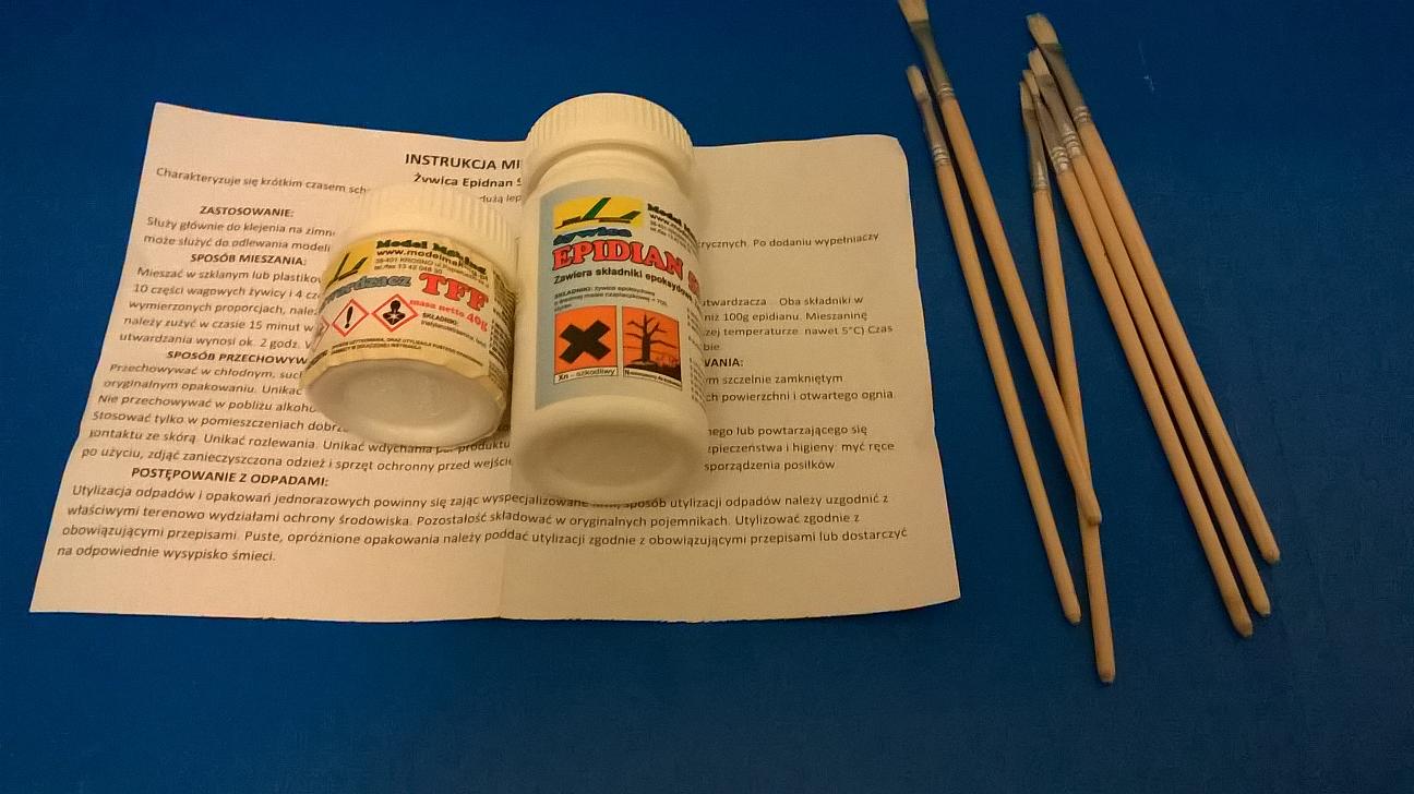 Przez ostatnie dni coś tam przy modelu codziennie robiłem, ale po kolei. Kadłuba jeszcze nie wzmacniałem. Musiałem zaopatrzyć się w żywicę. No i kupiłem, razem z pędzelkami dla dzieci, bo szkoda lepszych chyba do żywicy, skoro użyję je jeden raz