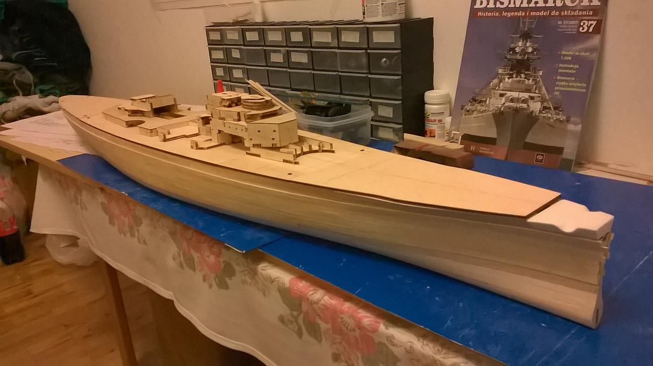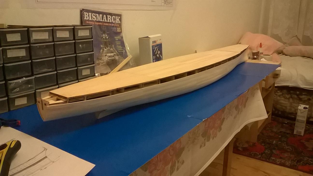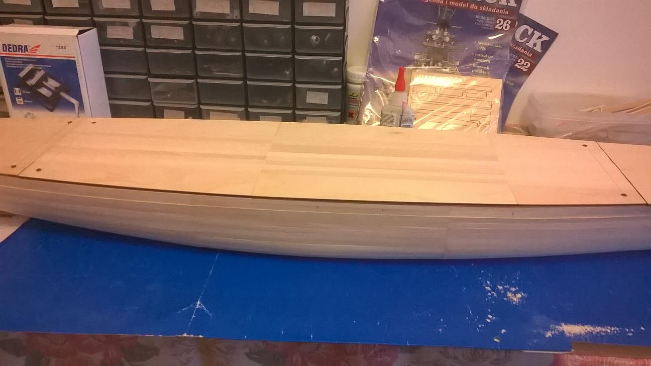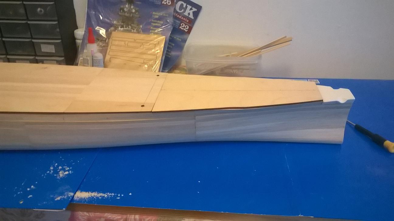 Witajcie koledzy. Od ostatniego postu trochę pracowałem nad Bismarckiem. Niestety nie wzmacniałem jeszcze poszycia. Były święta i jakoś brakło czasu na to, żeby pochodzić po sklepach. Wziąłem pod uwagę to co mówiliście na temat materiałów do wzmocnienia. Jutro mam wolne więc wybiorę się do sklepu modelarskiego i Castoramy. Spróbuję znaleźć tasiemkę o której mówił Marcin oraz tą szmatę szklaną - zobaczę co to jest i jakie ma właściwości. Jutro napiszę co kupiłem. Być może sprzedawca w modelarskim mi coś fajnego zaproponuje. Jeśli chodzi o to co zrobiłem przez ostatni tydzień, to pracowałem nad pokładami. Pokład dziobowy jest połączony i gotowy do przyklejenia. Pokład rufowy również jest sklejony i połączony z rusztowaniem. Sporo czasu poświęciłem na pokład pośrodku. Z resztą zobaczcie sami
