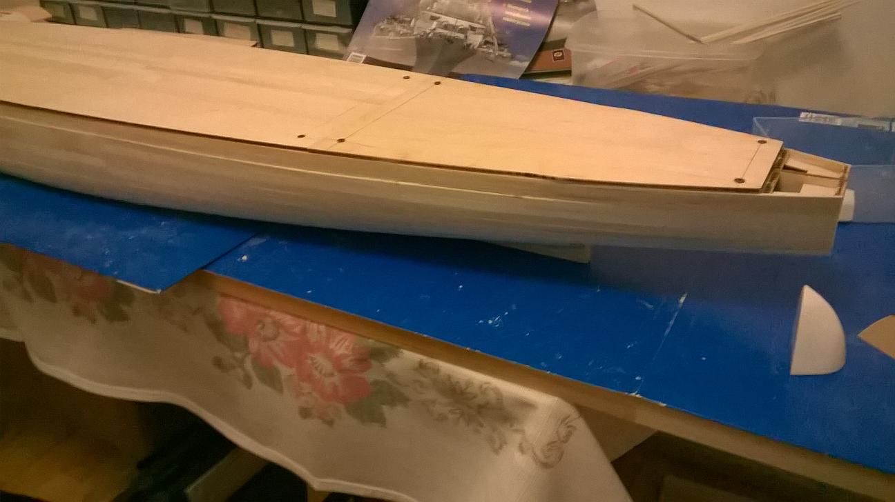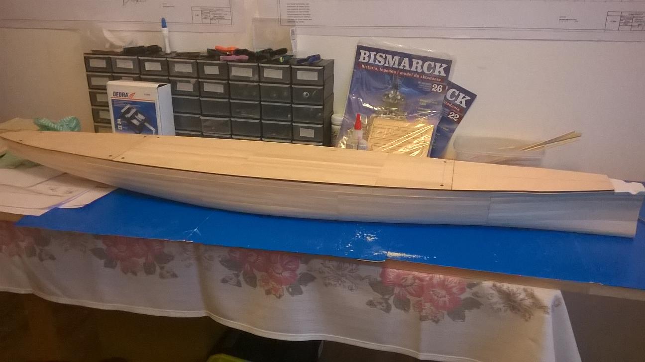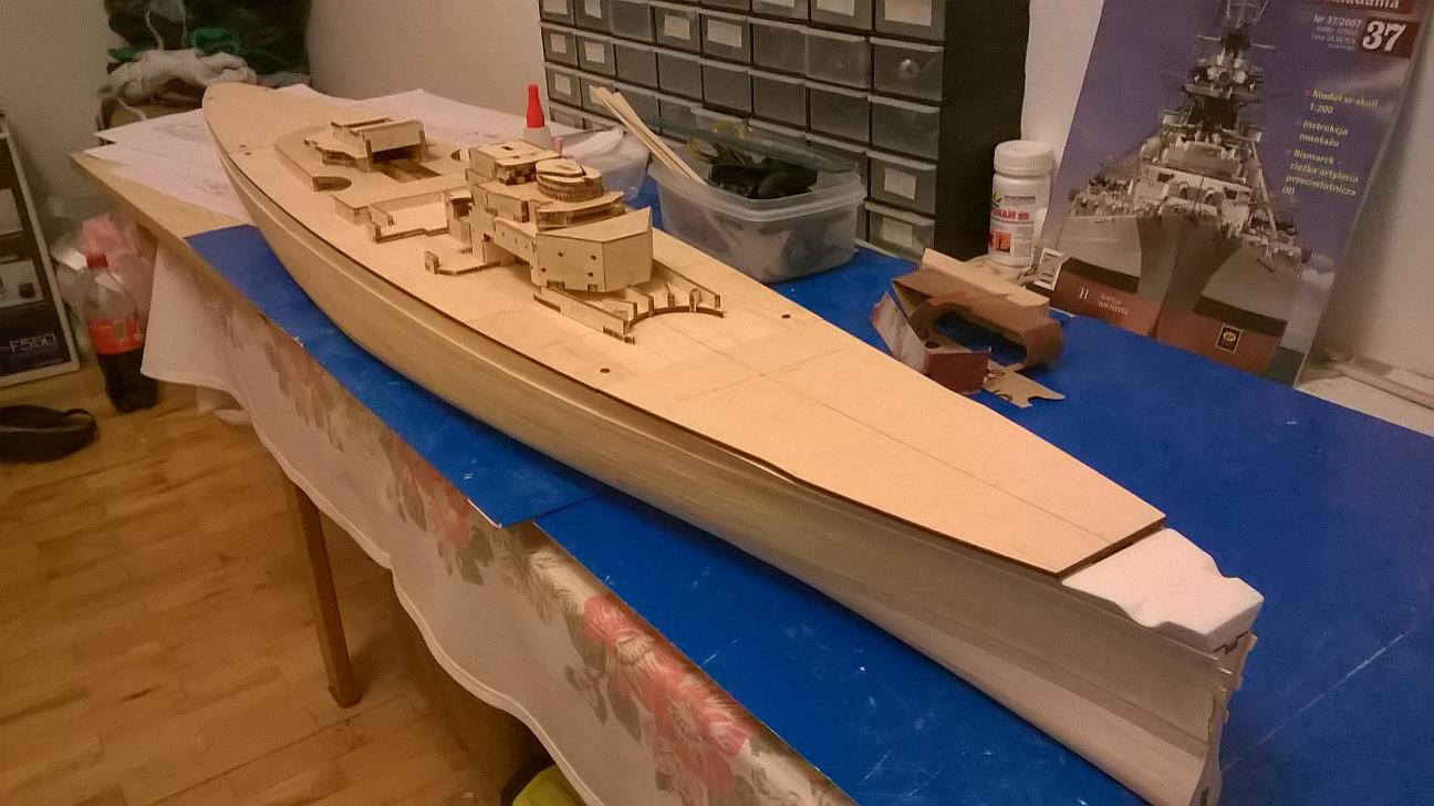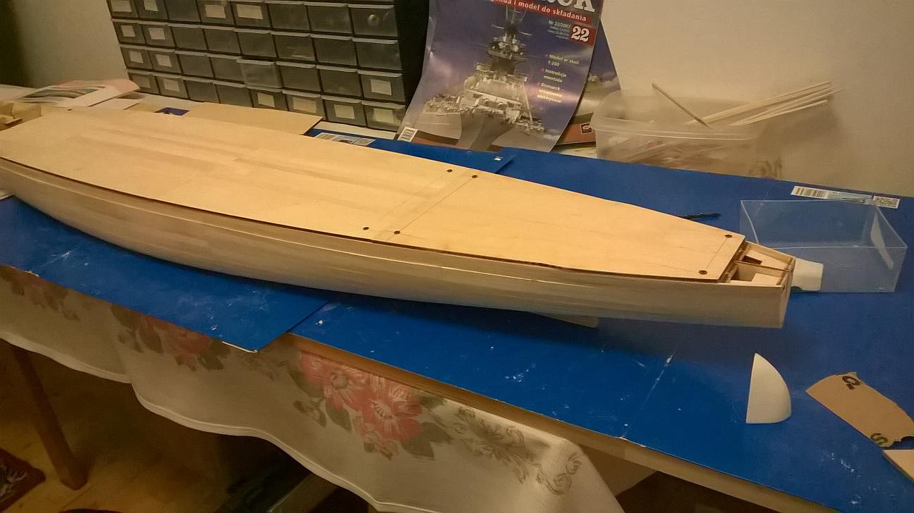 Witajcie koledzy. Od ostatniego postu trochę pracowałem nad Bismarckiem. Niestety nie wzmacniałem jeszcze poszycia. Były święta i jakoś brakło czasu na to, żeby pochodzić po sklepach. Wziąłem pod uwagę to co mówiliście na temat materiałów do wzmocnienia. Jutro mam wolne więc wybiorę się do sklepu modelarskiego i Castoramy. Spróbuję znaleźć tasiemkę o której mówił Marcin oraz tą szmatę szklaną - zobaczę co to jest i jakie ma właściwości. Jutro napiszę co kupiłem. Być może sprzedawca w modelarskim mi coś fajnego zaproponuje. Jeśli chodzi o to co zrobiłem przez ostatni tydzień, to pracowałem nad pokładami. Pokład dziobowy jest połączony i gotowy do przyklejenia. Pokład rufowy również jest sklejony i połączony z rusztowaniem. Sporo czasu poświęciłem na pokład pośrodku. Z resztą zobaczcie sami