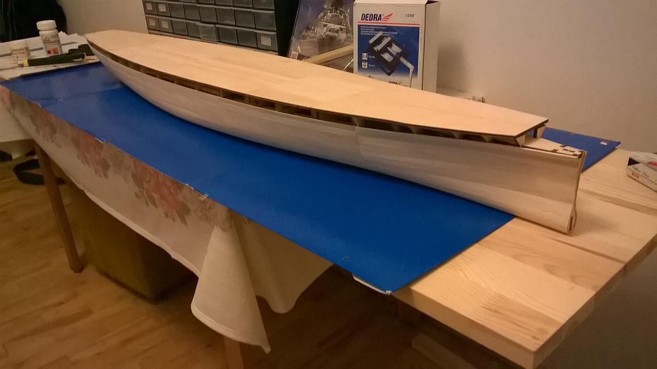 Co do wzmocnienia kadłuba od wewnątrz to nie wiem czy jest sens paćkania tego żywicą. Model i tak idzie do gabloty, wiec pływał nie będzie. Zresztą zrobisz jak zechcesz, tylko pamiętaj żeby nie laminować tego w domu bo po pierwsze ,zasmrodzisz cały dom, a po drugie możesz się nawdychać oparów. W najlepszym wypadku skończy się na bólu głowy, w najgorszym ... w oczach różowo a w mózgu niebiesko hehe.
