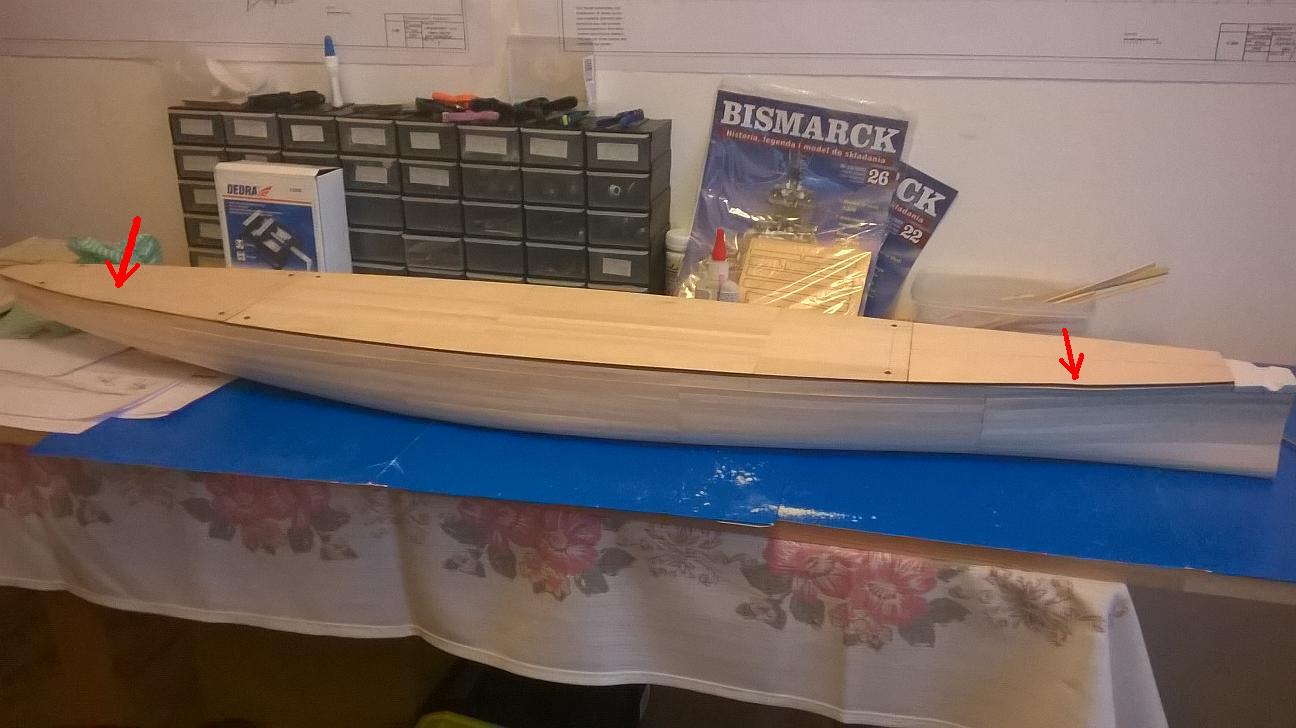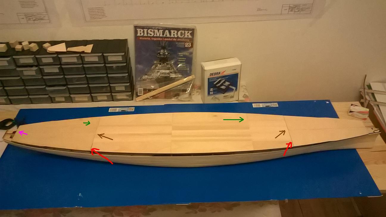 Oto prowizorycznie położony pokład. Generalnie póki co, listewki po środku mają aktualnie prawidłową długość. Problem stanowią elementy sklejki po bokach których nie szlifowałem a mimo to są odrobinę za krótkie, tam gdzie narysowałem czerwone strzałki. Mam takie rozwiązanie, choć nie wiem czy dobre. Zaszlifowałbym listewki do poziomu sklejek, tam gdzie są brązowe strzałki i dosunął bym pokłady do siebie tak jak narysowałem zielone strzałki. Powstała by wtedy różnica wynosząca około 2 milimetry tam gdzie różowa strzałka. Pytanie tylko, czy mogę tak zrobić. Czy uda mi się to potem zretuszować szpachlówką. Zaznaczę jeszcze, że to wszystko to jest tylko podstawa pokładu i na nią idzie jeszcze później pokład właściwy.