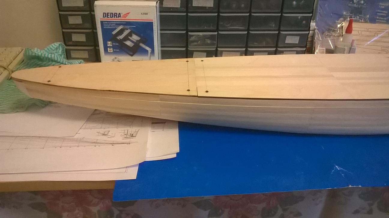 Powinieneś układać listewki na zakładkę tak jak co to zaznaczyłem. Jeśli będziesz dalej tak je układać i w miejscach ja to w czarnym kółku szpachla będzie odskakiwać aż miło a na farbie szybko odznaczy się to łączenie, to samo tyczy się kadłuba. Pamiętaj również o smarowani brzegów listewek klejem jeśli tego nie zrobisz wszystko farba na łączeniach szybko popęka znacząco psując efekt twojej pracy