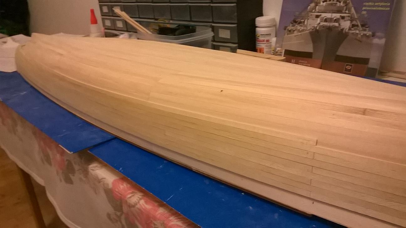 Na początku postu chciałem odwołać się do wypowiedzi Sebastiana. Widzisz, gdy kupiłem model i zacząłem go budować, to kierowałem się tym co sugerował wydawca. Według opracowania pierwsze poszycie kadłuba robi się listewka obok listewki. Tak też zrobiłem. Ludzie z wydawnictwa dokładnie policzyli też listewki i na koniec została mi tylko jedna. Patrząc z perspektywy czasu to gdybym przerabiał poszycie to pewnie brakło by mi tych listewek. Nie mogłem więc raczej zrobić tego inaczej. Jeśli chodzi o listewki pokładu, to tu chyba masz rację. Mogłem obliczyć listewki i zrobić na mijankę. Jednak znów kierowałem się opracowaniem, a gdy umieszczałem poprzedni post to listewki na pokładzie były już przyklejone. Jednak tak, czy inaczej, wszystkie listewki, na pokładzie i na kadłubie starałem się kleić ze sobą, tak jak pisałeś. Drugie poszycie jest już według projektu - na mijankę i na pewno tak je wykonam.