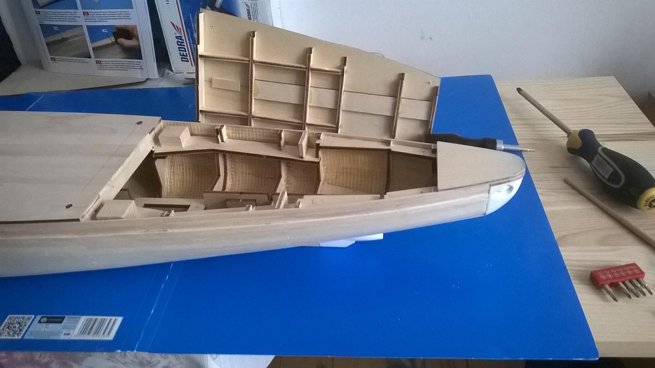 Po tym wszystkim przyszła pora na pokłady. Na początku chciałem powiedzieć, iż nie przyklejałem ich póki co na stałe. Umieściłem w szkielecie drewniane klocki zgodnie z opracowaniem, wywierciłem 1,5 milimetrowe otwory na śruby w klockach i pokładach i poszerzyłem je do 3 mm na pokładach tak jak w wersji modelu RC. Wydawca radził aby pokład przybić gwoździami. Nie mocowałem pokładu na stałe ponieważ stwierdziłem, że czeka mnie jeszcze przeciż jedno poszycie, poza tym w razie gdyby coś trzeba było poprawić lub przerobić to nie będę miał już jak. W razie gdybym potem miał usunąć śruby, to otwory łatwo można zaszpachlować. Nie przyklejałem też pokładu dziobowego który w obydwu wersjach ma być przytwierdzony na stałe. Oto jak to wszystko wygląda :