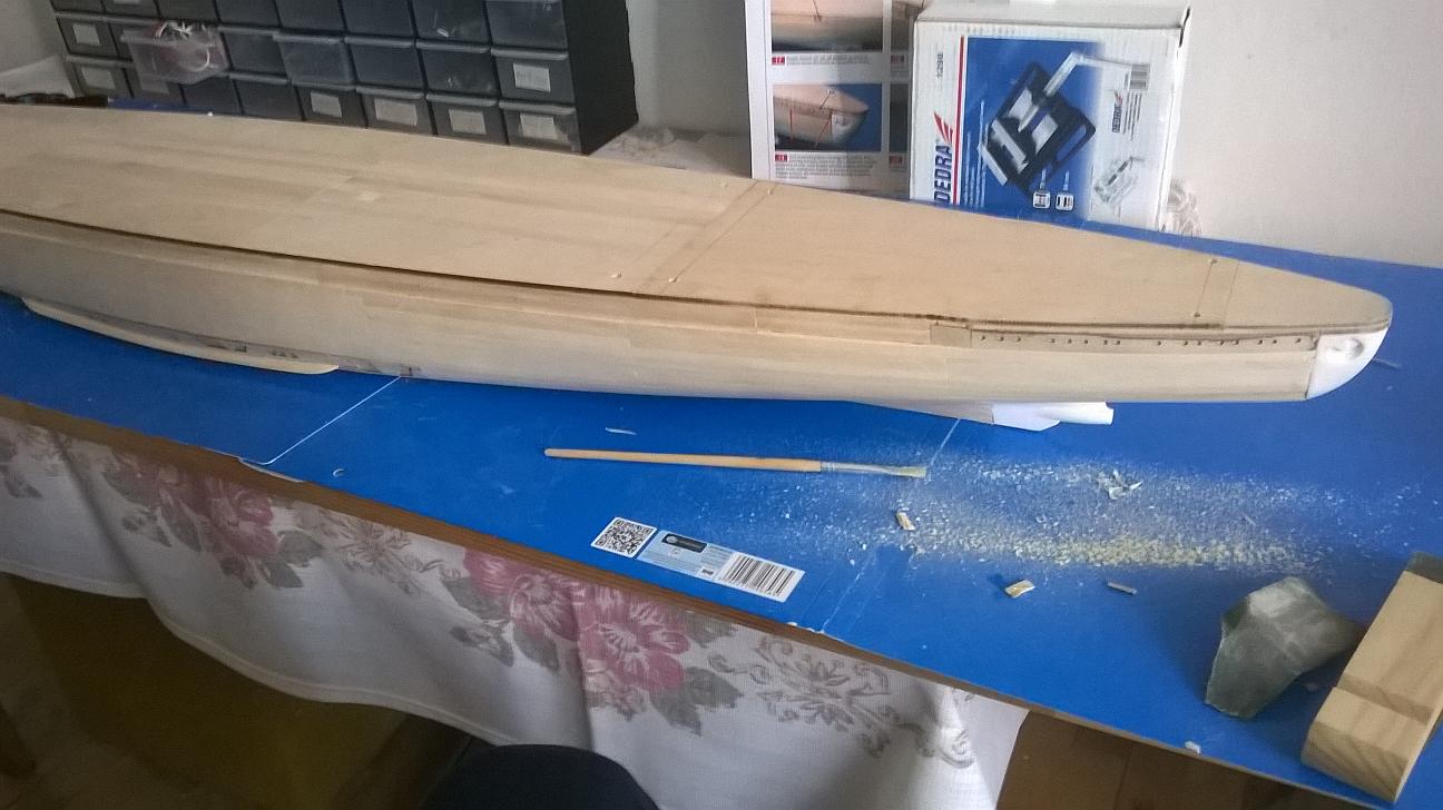 Aby sobie z tym poradzić wyciąłem fragmenty listewek, wyrównałem resztę z pokładem i całość z prowizorycznie położonym pokładem rufowym wyglądała tak: