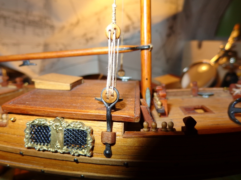 2. Nie wiem jak jest to narysowane na Twoich planach, lub w instrukcji budowy, ale koniec liny talii kotwicznej w realu na pewno nie był mocowany do kotbelki przy pomocy supła (jeśli już to gałką bosmańską). Zwykle końcówki lin mocowane są do oczek wpuszczonych w burty lub pokład, a w tym przypadku w kotbelkę. Zresztą sprawdź w innych relacjach. Nie mówiąc o tym, że lina talii wydaje się dużo za gruba.