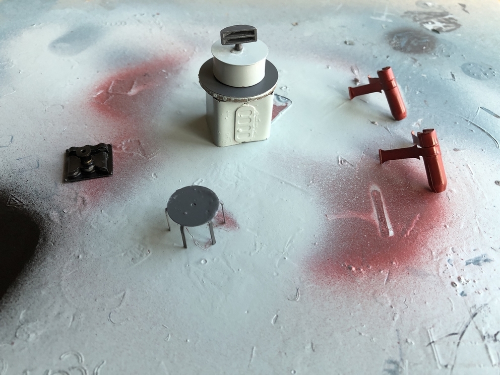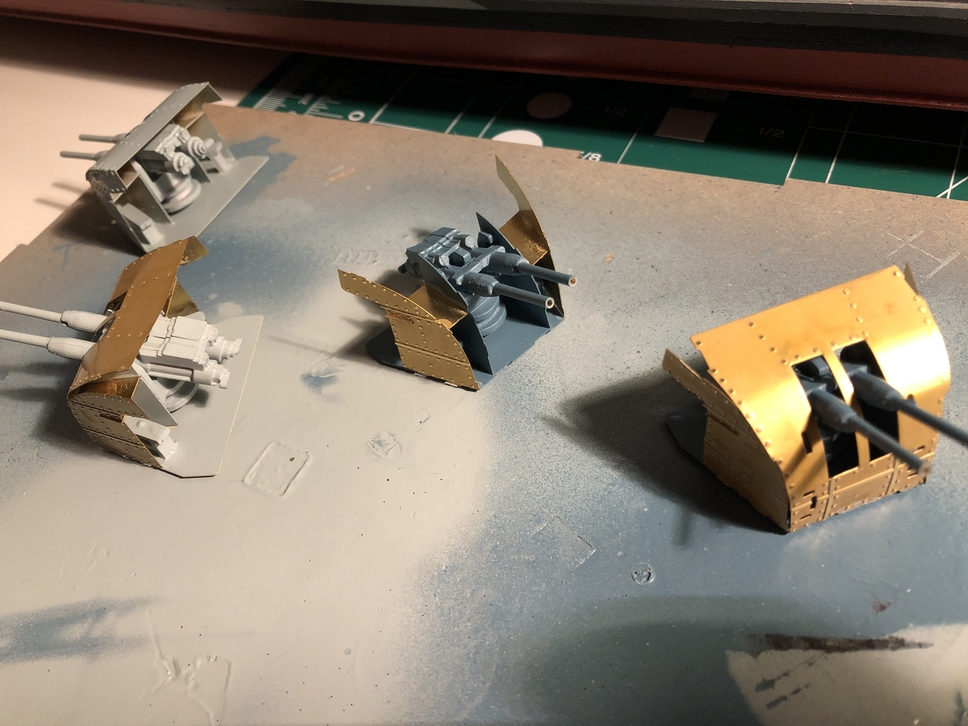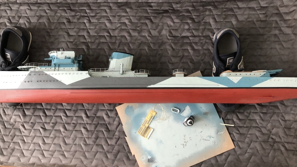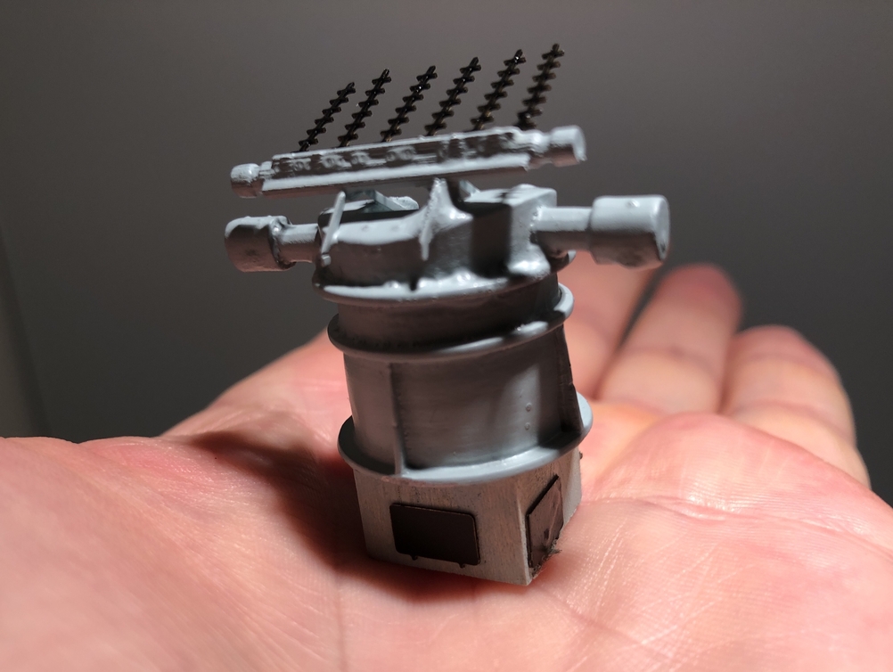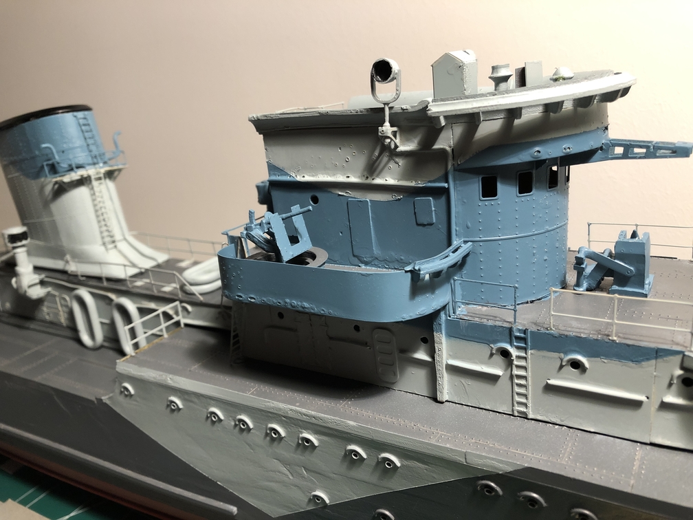 Trochę prac z nadbudówką dziobową (osadzenie drabinek, dział przeciwlotniczych). Plus wykonany i osadzony komin. Okręt zaczyna nabierać sylwetkę.