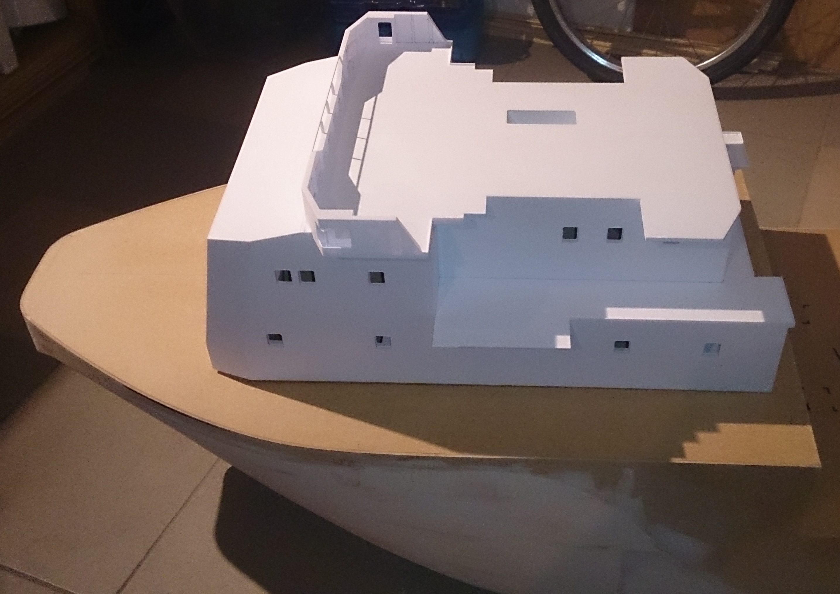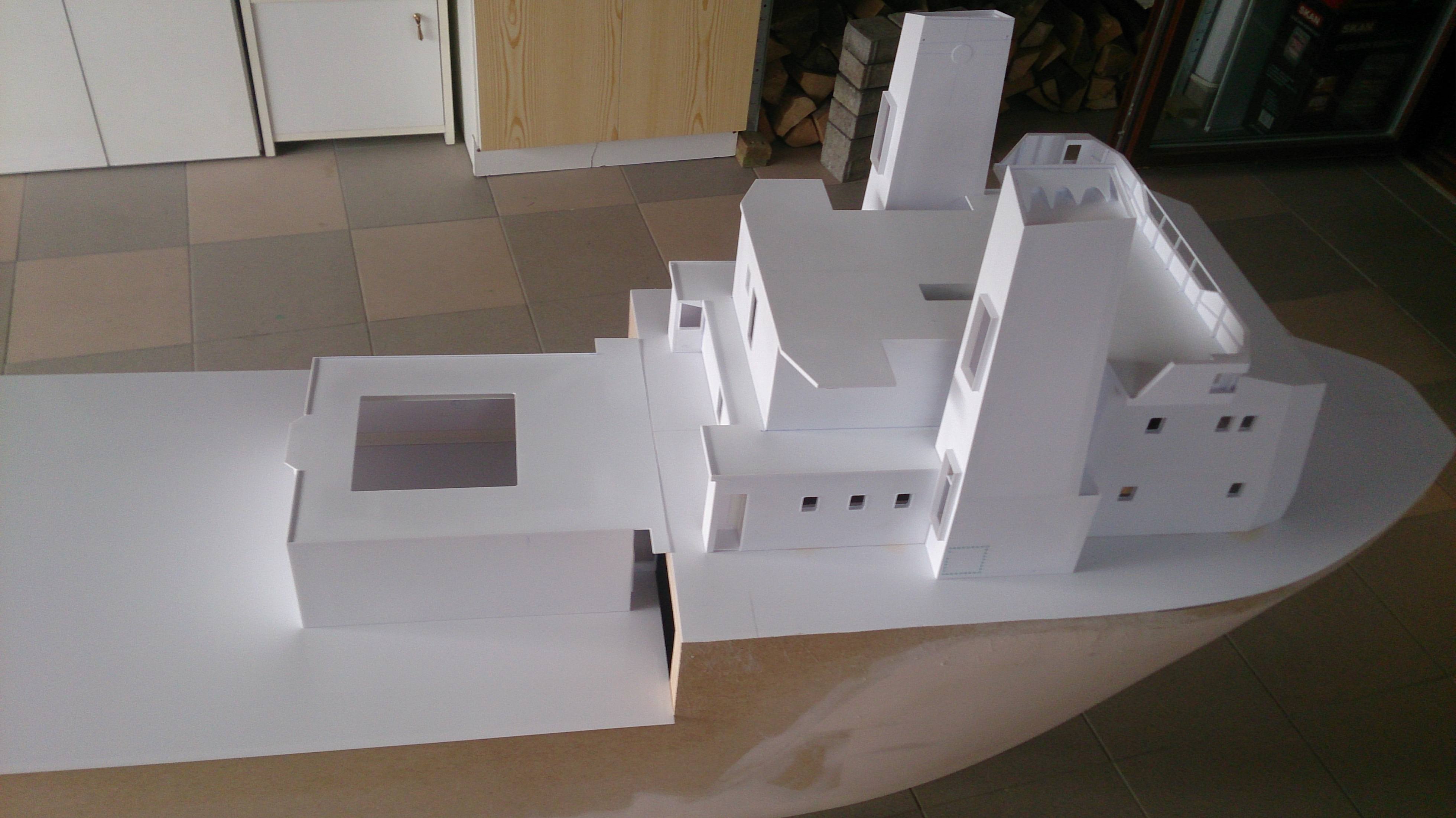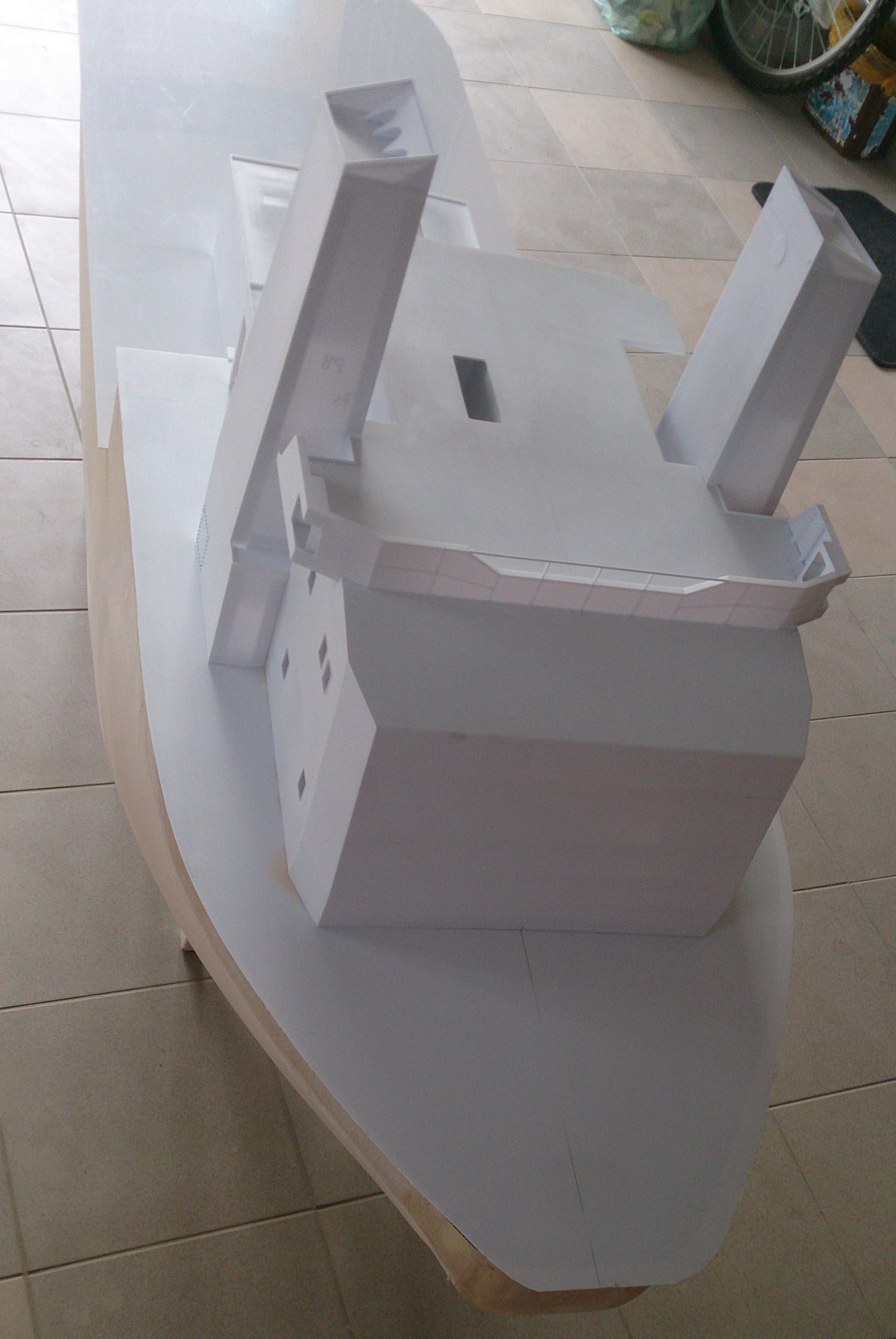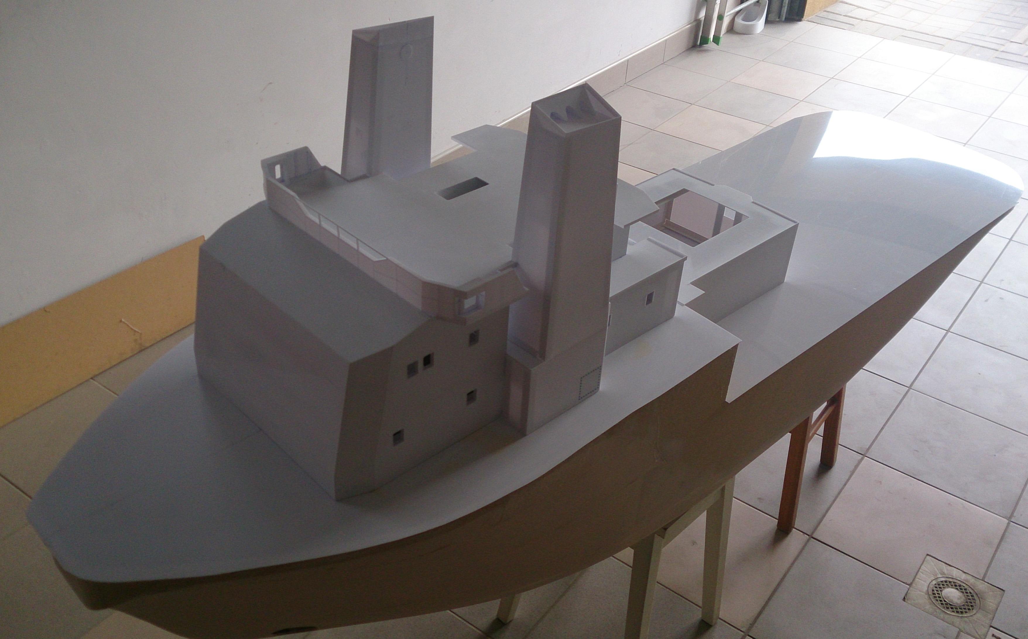 Buda prawie w całości (bez sterówki i już sklejonych ale nie zamocowanych kominów i platformy między nimi) zdjęcia poprzednio i postawiona na pokładzie do przymiarki. Jutro dopasowywanie do krzywizny pokładu
