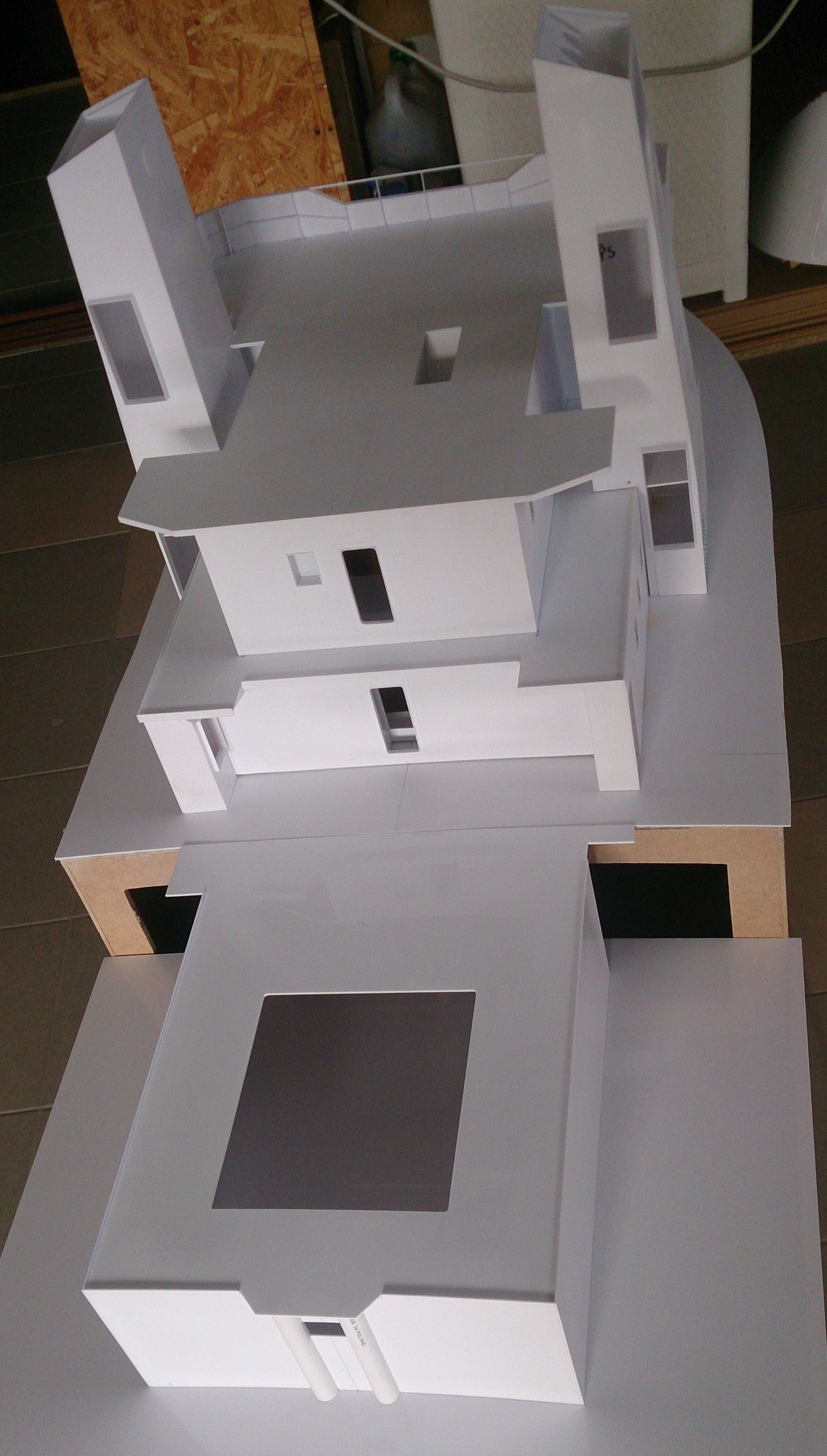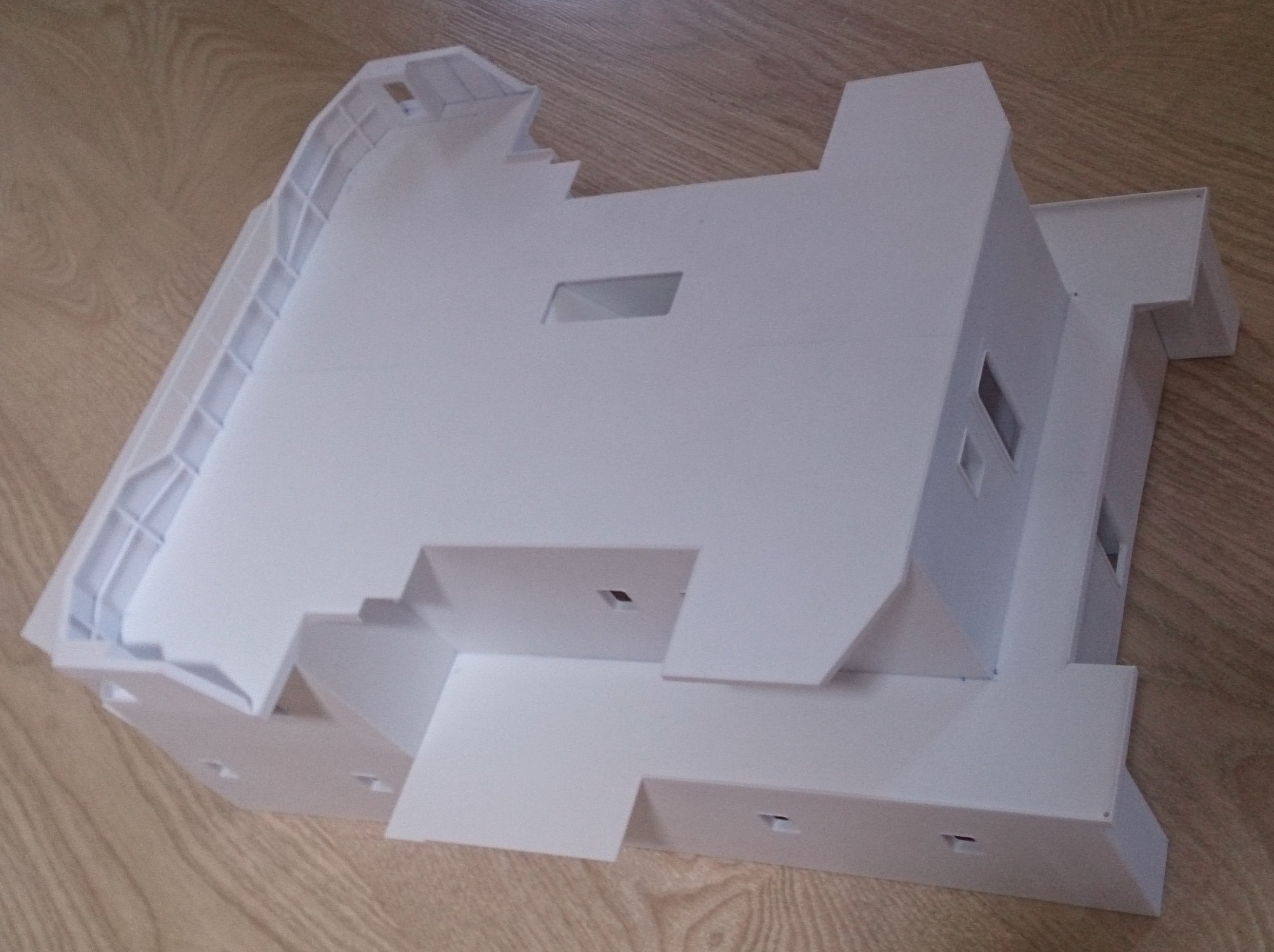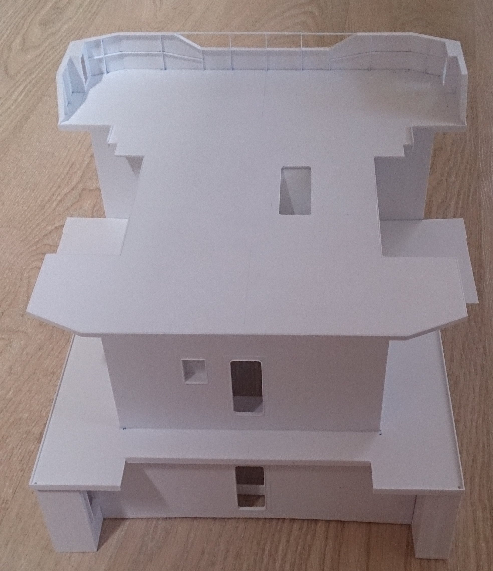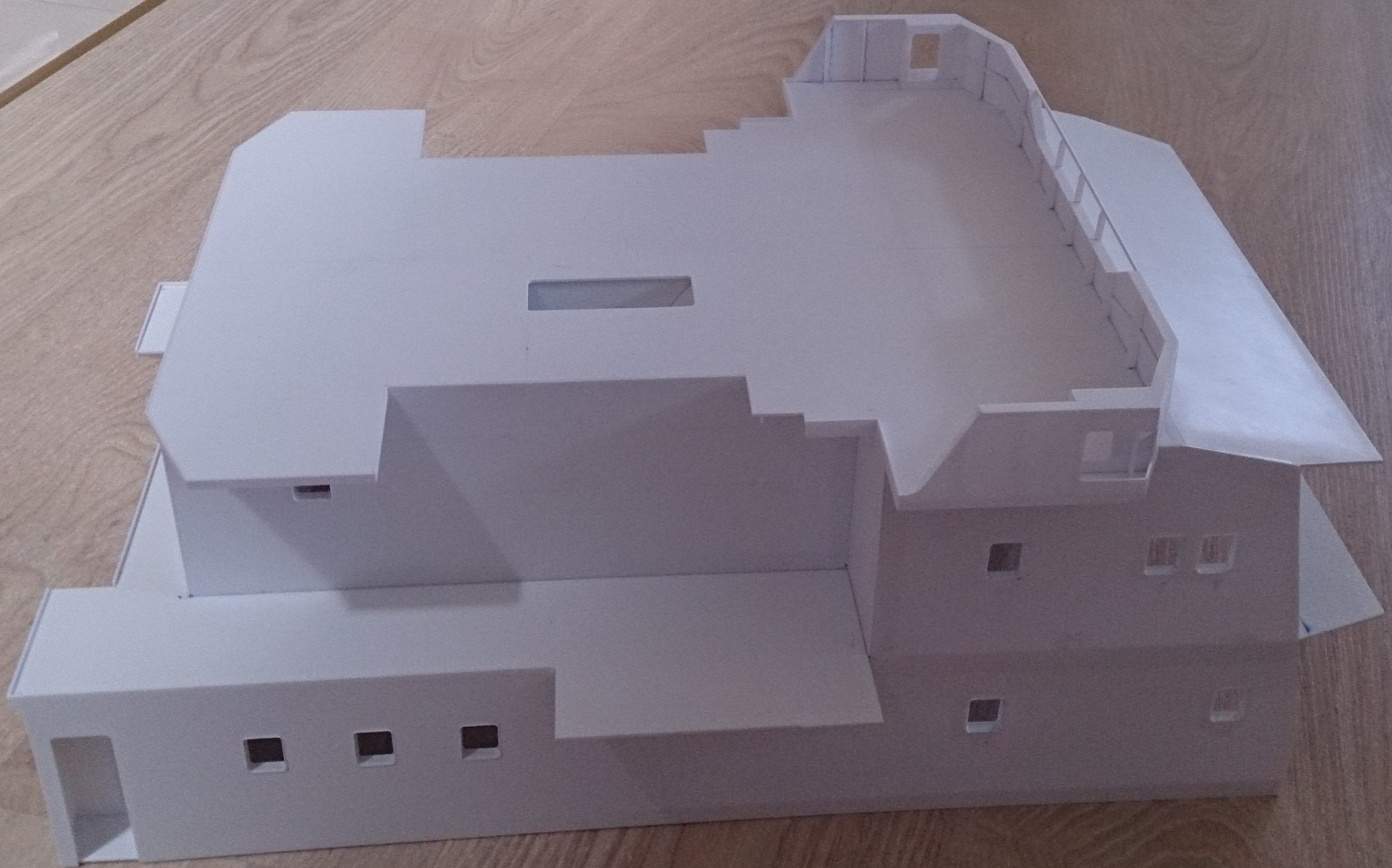 Buda prawie w całości (bez sterówki i już sklejonych ale nie zamocowanych kominów i platformy między nimi) zdjęcia poprzednio i postawiona na pokładzie do przymiarki. Jutro dopasowywanie do krzywizny pokładu