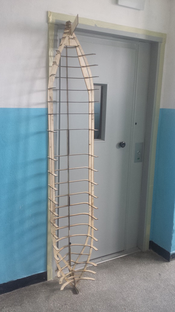 Załączam dla porównania szkielet... w między czasie dodałem jedną wręgę... (w środkowej części kadłuba) po oklejeniu szkieletu w miejscu gdzie nie było wręgi poszycie się strasznie odkształcało... więc przed laminowaniem dorobiłem wręgę i cały kadłub wyprostował się idealnie
