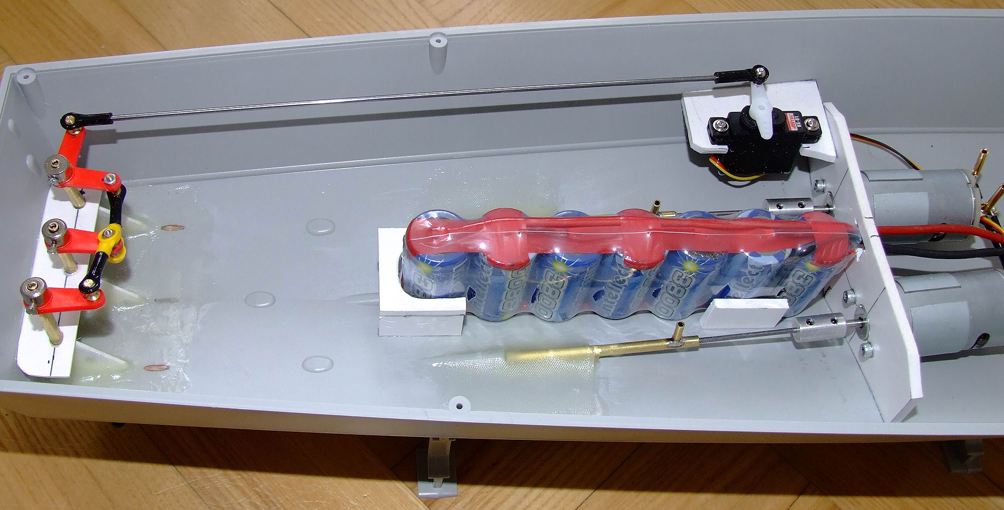 Na poniższym zdjęciu jest pokazane wnętrze mojego ELCO, model jest "plastikowy" więc rezonuje w nim wszystko co może, a mimo to podczas pływania cały napęd zachowuje się bardzo cicho, bo żeby rezonować to musi mieć od czego, np. proste i tanie modelarskie przeguby cardana są własnie takim źródłem drgań wszelakich.