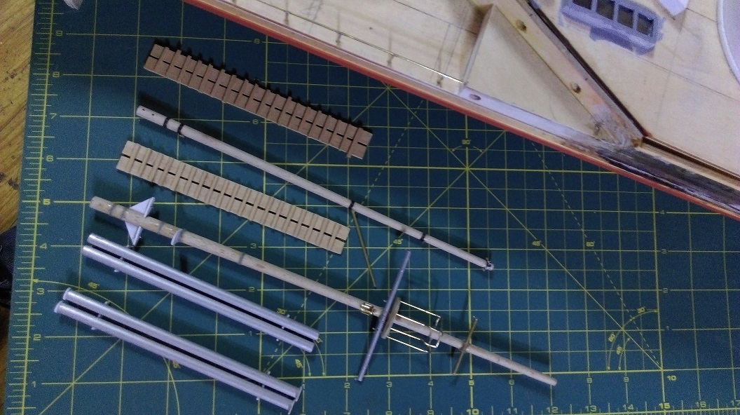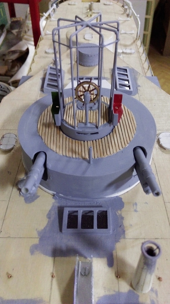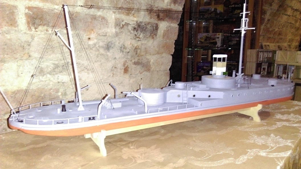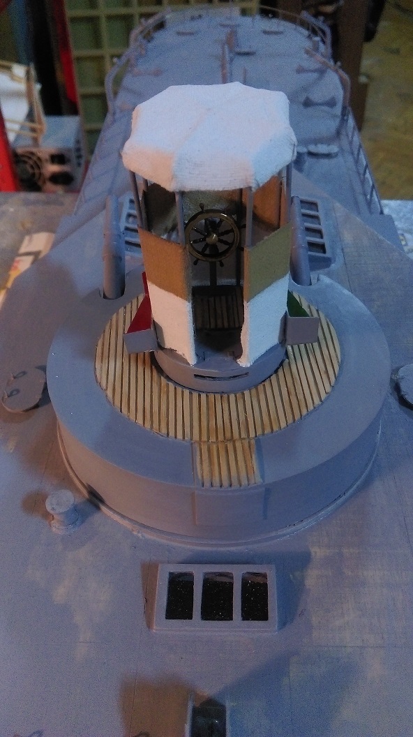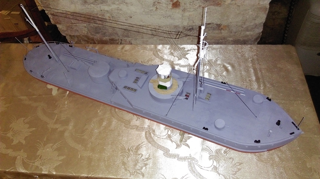 W zasadzie to dziś zrobiłem sterówkę oraz lekko zagruntowałem model przed malowaniem. A z powodu że mój poprzedni model to pociąg pancerny i raczej z marynistyką to tak sobie jestem, to mam pytanie jakie flagi i gdzie się wiesza bo na dziobie jest flagsztok, maszt przedni to pewnie flagi sygnałowe ( ale jakie?), ale co się wiesza pod gaflem tylnego masztu bo na rufie to banderę, nie mogę nigdzie tego znaleźć, mam zdjęcie monitora z Muzeum Wisły w Tczewie ale tam nic na masztach czy na dziobie nie ma zawieszonego