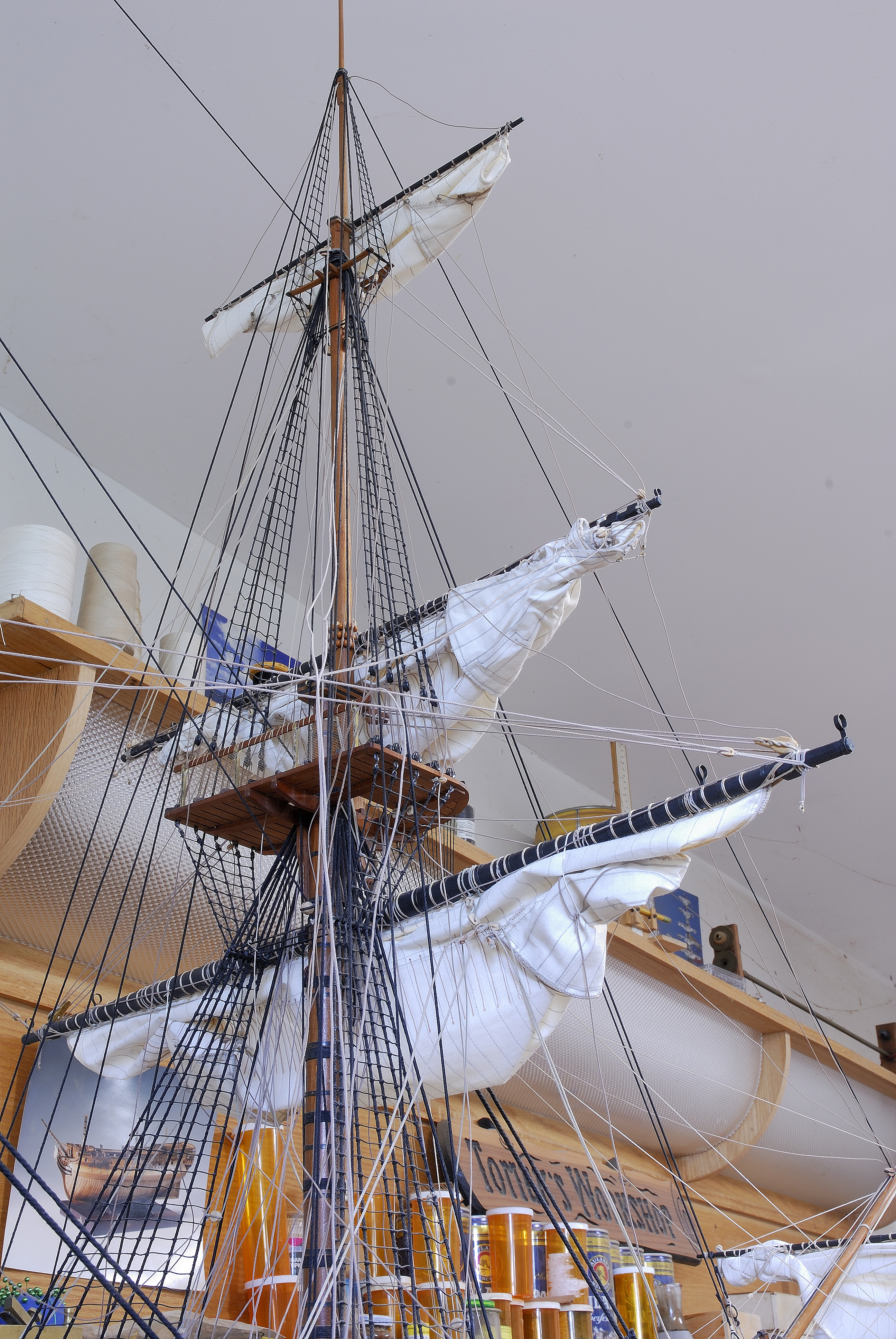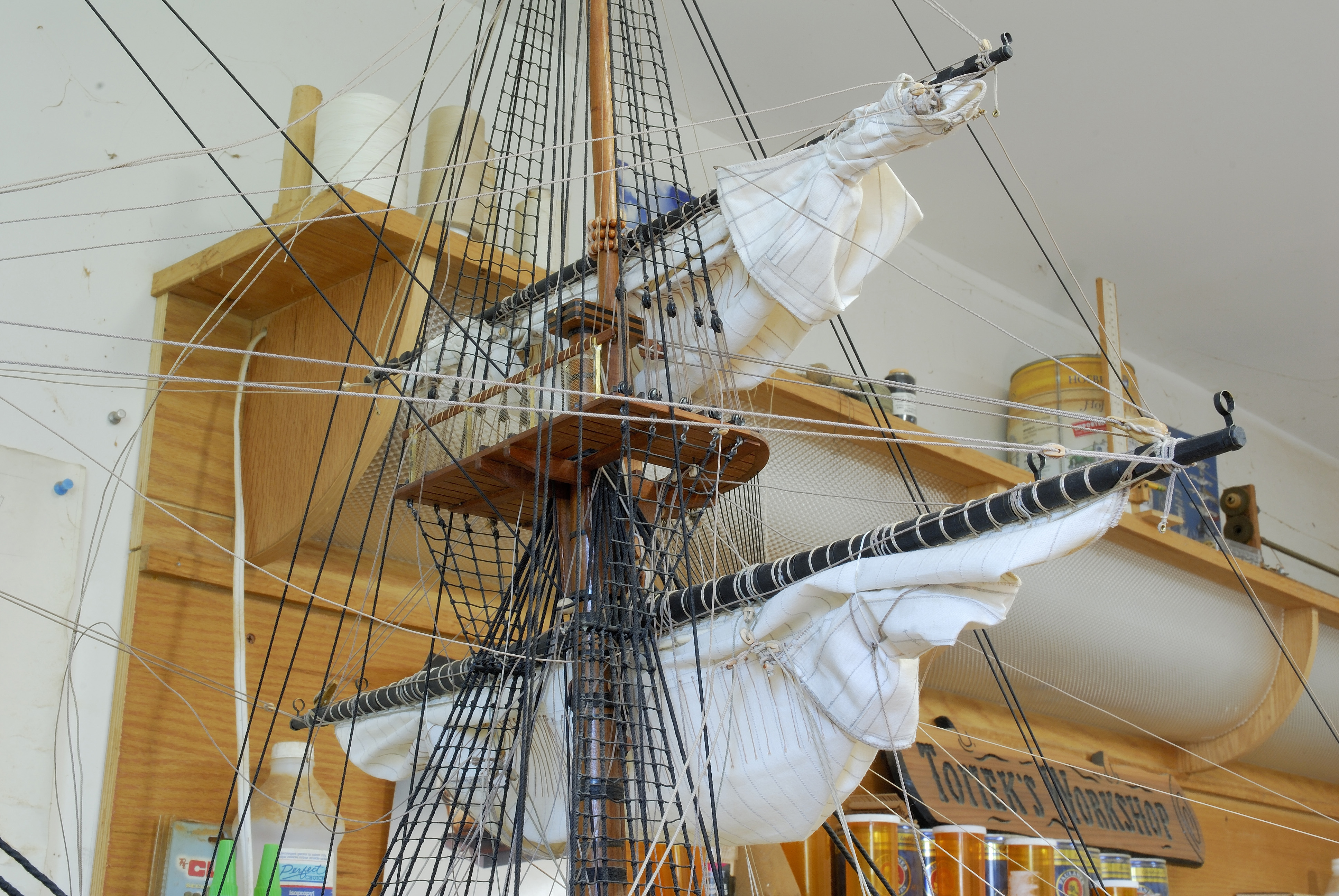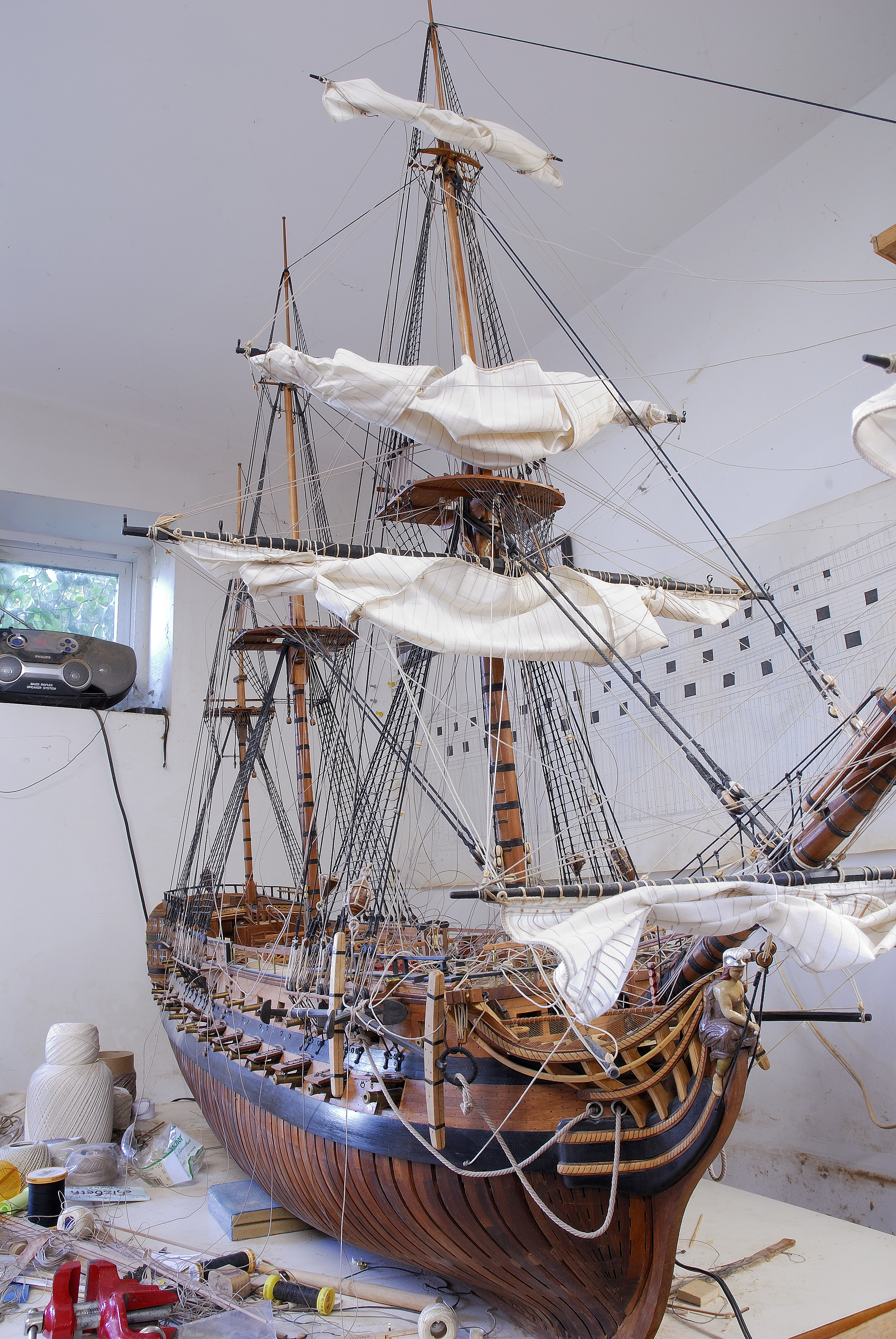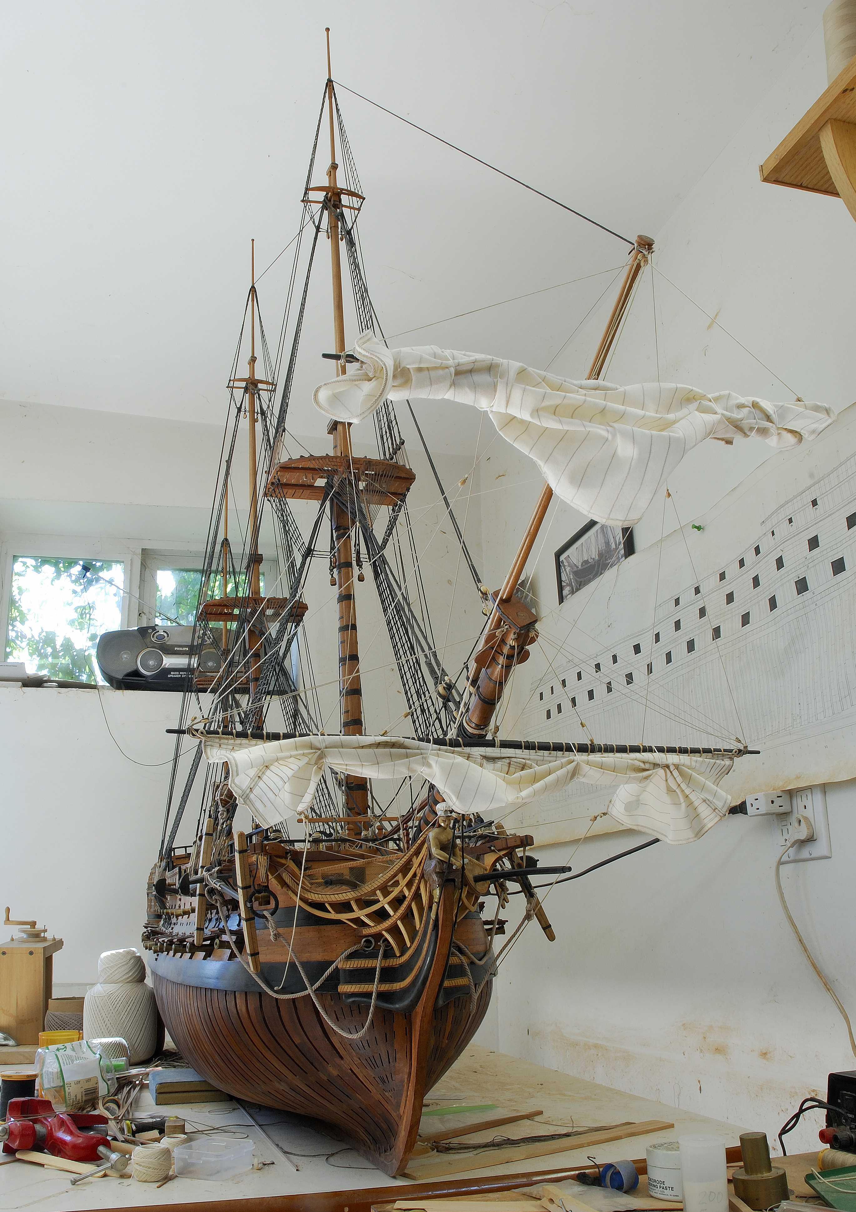 Do tej pory udalo mi sie zamontowac dwa zagle na bukszprycie, ze wszystkim im przynaleznym takielunkiem. Teraz pracuje nad trzema zaglami od foka, a potem przyjdzie kolej na grota, itd... W dalszej kolejnosci zajme sie trojkatnymi zaglami lacinskimi na sztagach, tzw. fore-and-aft sails.