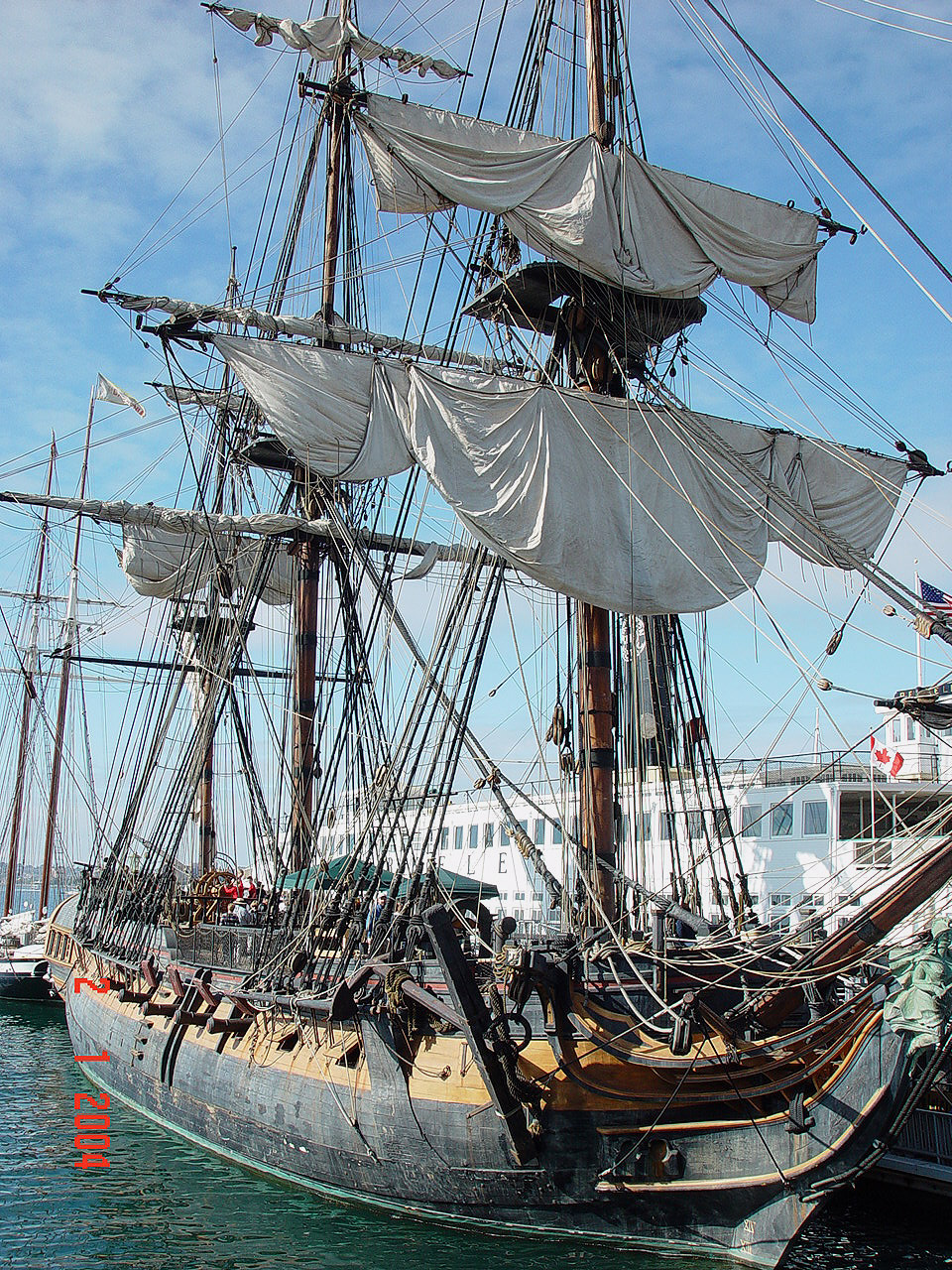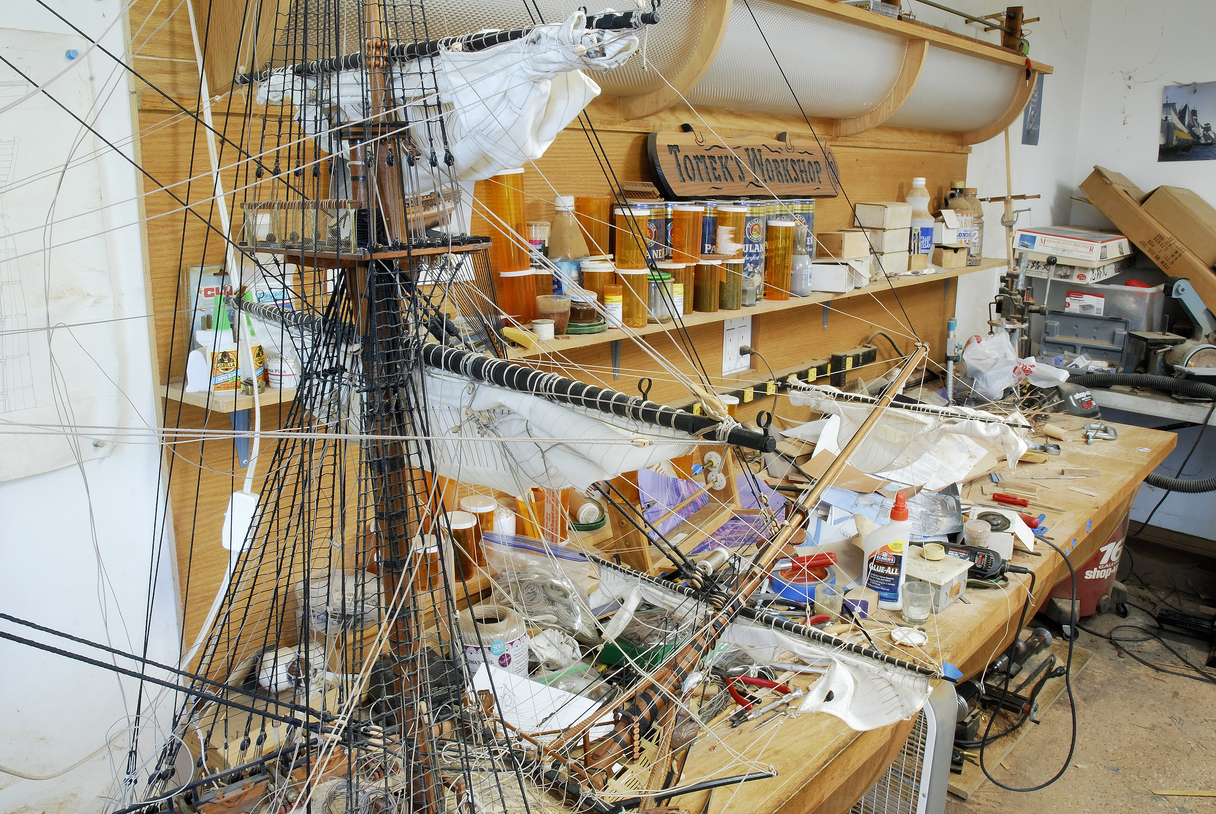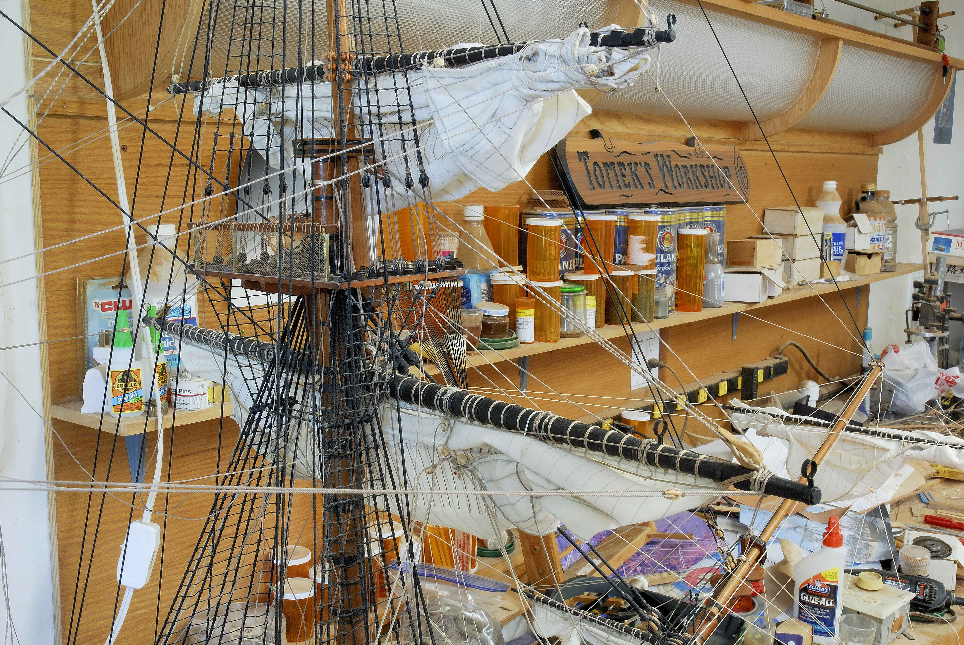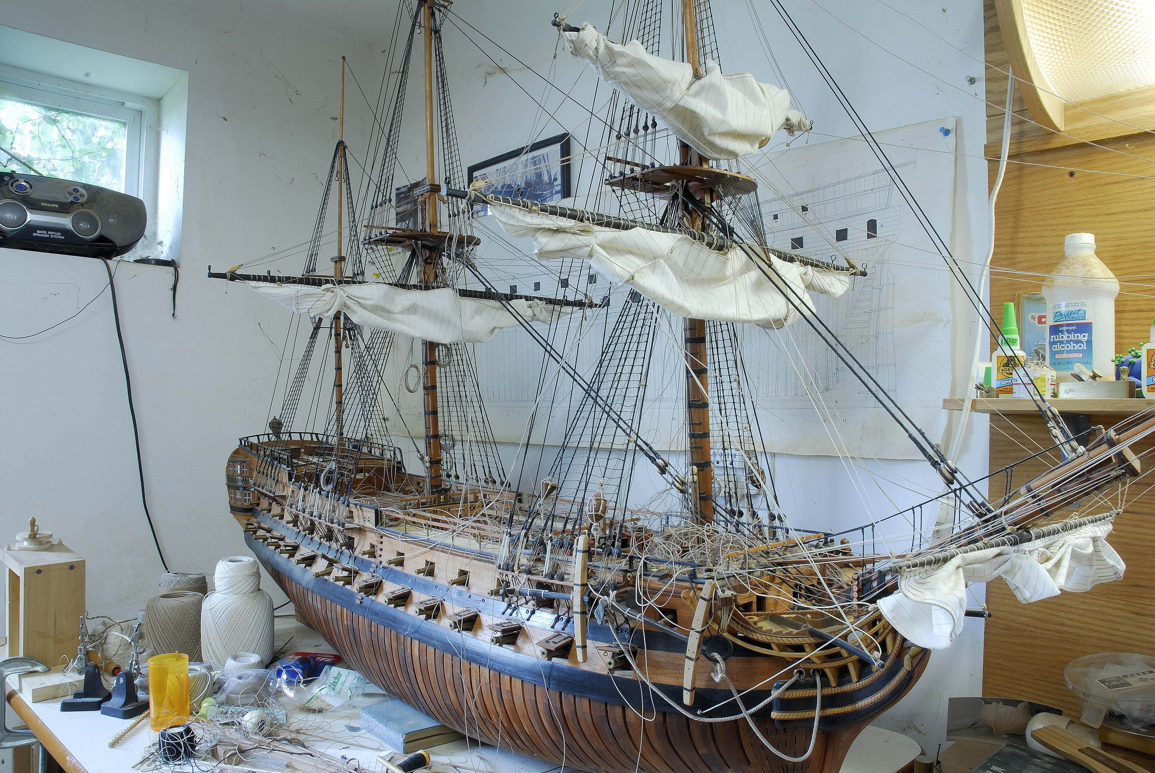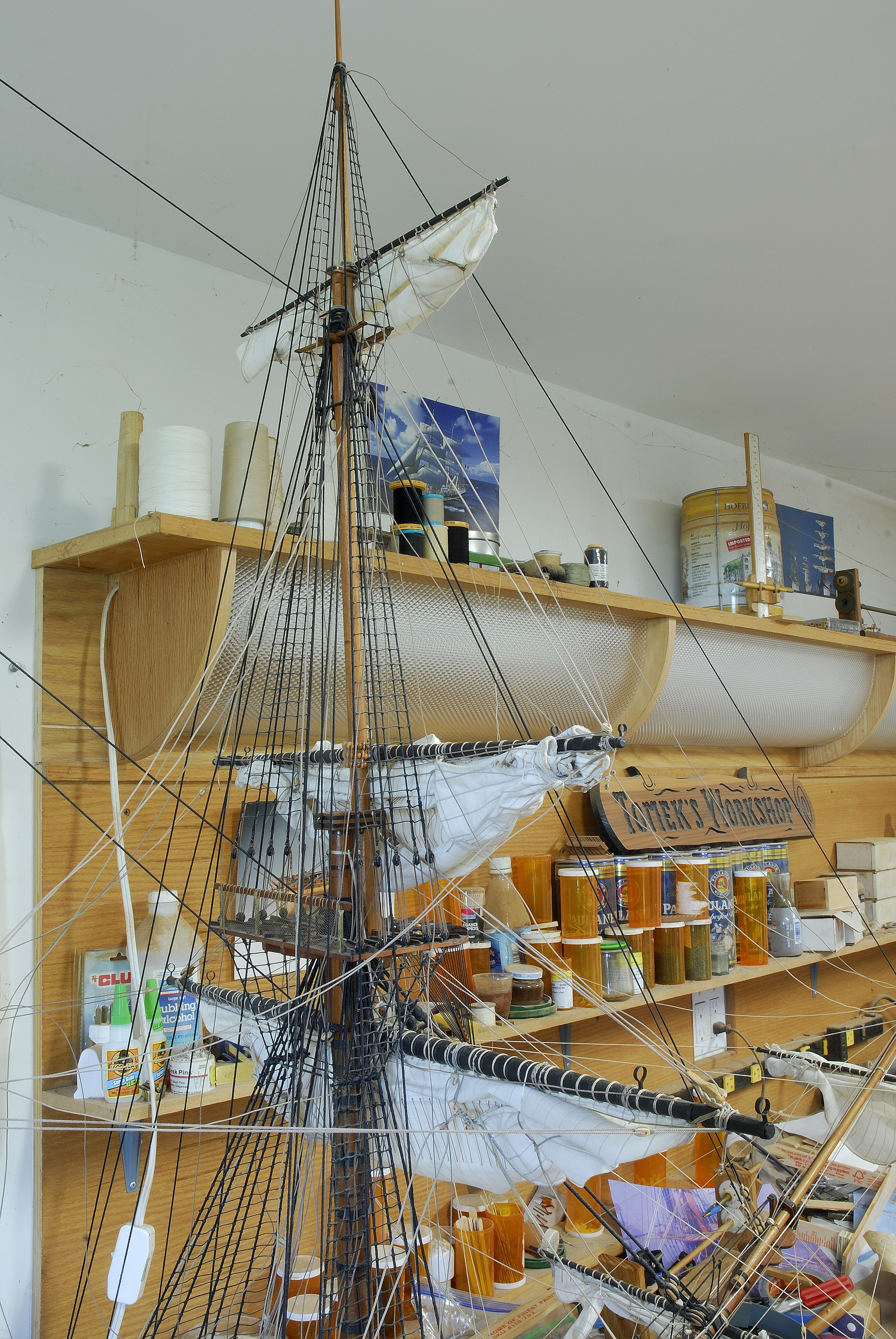 Do tej pory udalo mi sie zamontowac dwa zagle na bukszprycie, ze wszystkim im przynaleznym takielunkiem. Teraz pracuje nad trzema zaglami od foka, a potem przyjdzie kolej na grota, itd... W dalszej kolejnosci zajme sie trojkatnymi zaglami lacinskimi na sztagach, tzw. fore-and-aft sails.