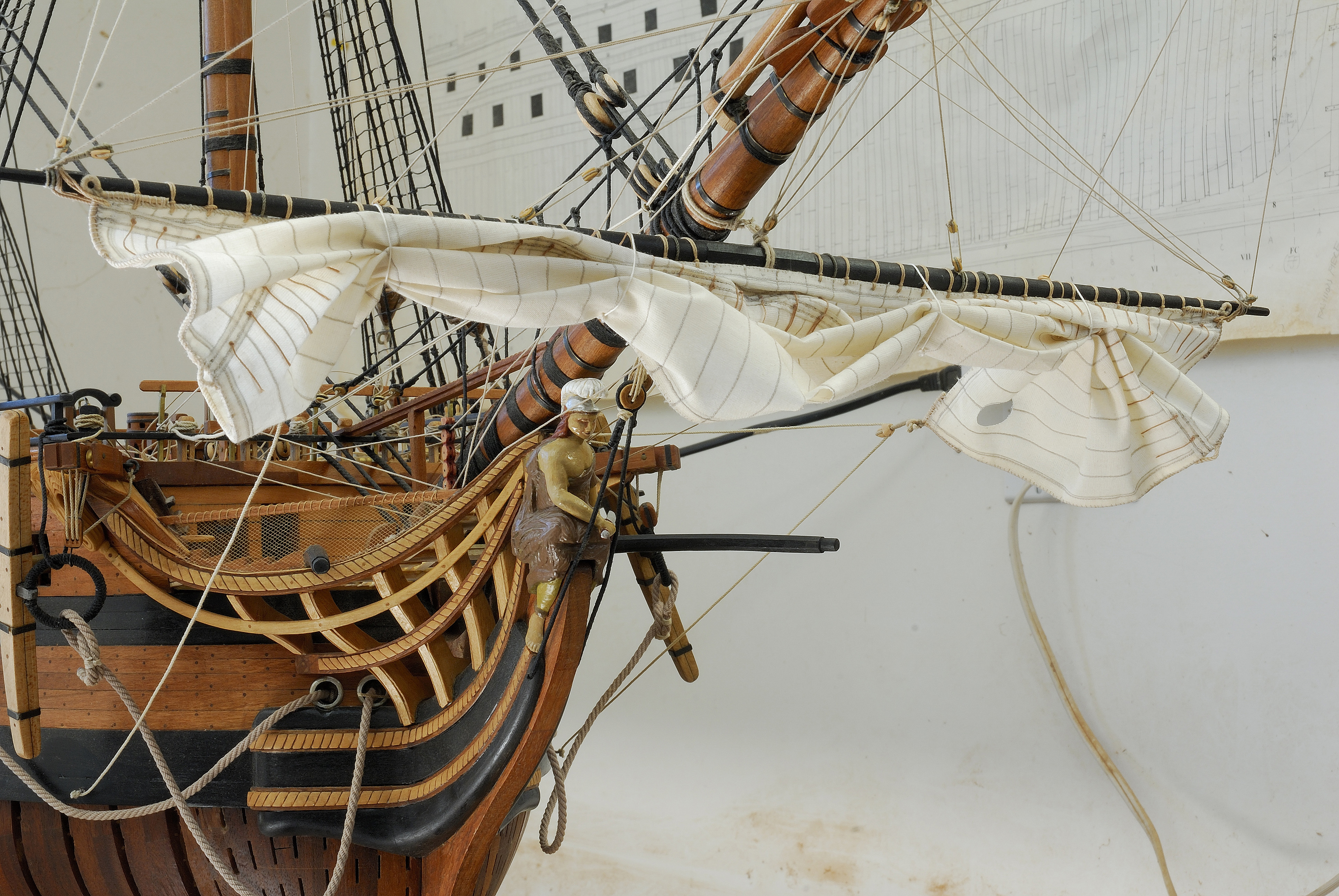 Ostatnio zaczalem swa przygode z zaglami. Po pewnym przemysleniu problemu, zrezygnowalem jednak z silkspan'u na korzysc cieniutkiego muslinu, ktory znalazlem niedrogo w lokalnym sklepie z materialami. Zaleta tegoz byl fakt, ze moglem na nim "uszyc" poszczegolne pasy, zaznaczajac je drobnym sciegiem maszynowym (1 mm), a takze recznie poprzyszywac tzw. bolt rope na krawedziach zagli oraz tzw. cringles i clues (nie znam polskich nazw). Dodatkowo ten material mial juz fabrycznie nadany kolor - jasny kolor skorupki jajka idealnie nadajacy sie na zagle i nie muslalem sie bawic w podkolorowywanie tegoz. Wada jest fakt, ze muslin, mimo iz super cienki, to jednak jest zbyt gruby i sztywny by oddac w nim wszystkie faldy i zagiecia plotna (w skali) w konfiguracji zagli tzw. brailed up (czesciowo tylko podciagnietych na rejach) - jak to widac na przykladzie muzealnej HMS Surprise. (sIlkspan bylby do tego lepszy).
